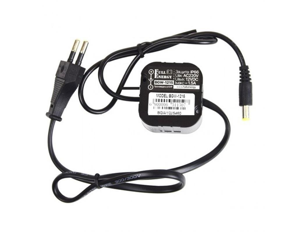 Вихід: +12/1.5А, роз’єм живлення; Вхід: ~ 220В, мережевий шнур з вилкою в розетку. Клас захисту: IP66; Довжина кабелю: 40см (від БЖ до роз’єму) + 40см (від БЖ до вилки); Розміри: 43х40х27мм |
