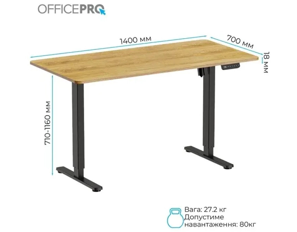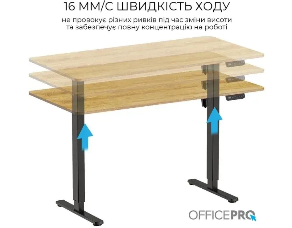 Стіл із електрорегулюванням висоти Officepro серії ODE1470 розроблений для бездоганної інтеграції в будь-який домашній інтер'єр або корпоративне середовище, пропонує ідеальне поєднання функціональності, довговічності та доступності. Завдяки потужному двигуну стіл забезпечує плавне, тихе та надійне регулювання висоти одним натисканням кнопки.