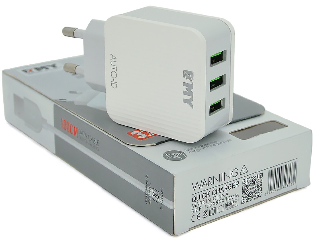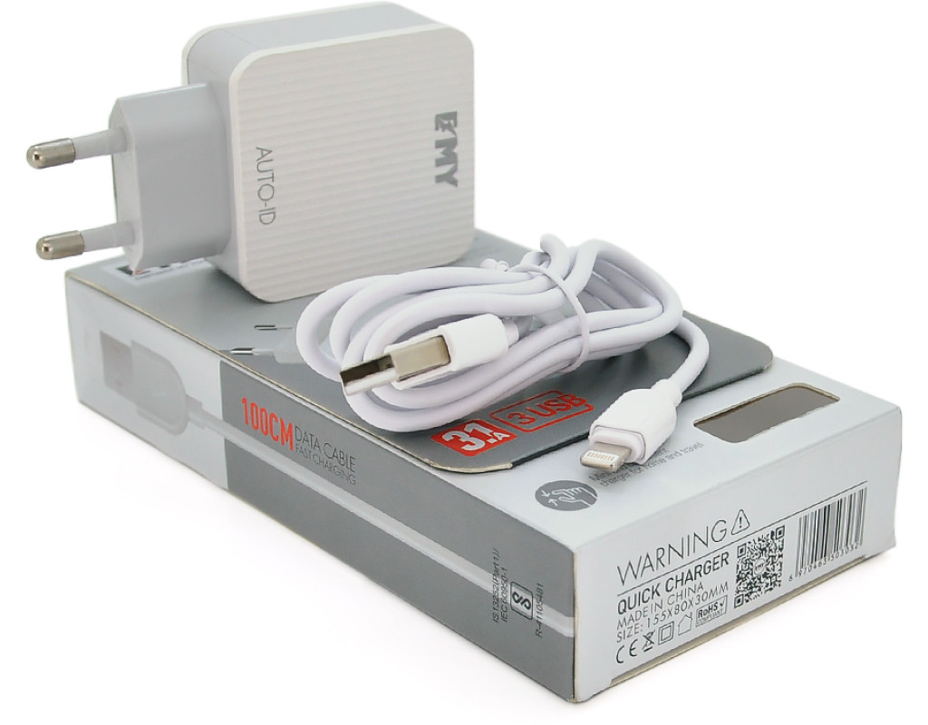 | Компактний та зручний зарядний пристрій з кабелем у комплекті, призначений для швидкого та безпечного заряджання мобільних пристроїв. Ідеальне рішення для дому, офісу або подорожей завдяки універсальній вхідній напругі та трьом USB-портам. Основні характеристики: - Тип: зарядний пристрій + кабель (набір 2 в 1) - Вхідна напруга: 110-240 В (змінний струм, 50 / 60 Гц) - Вихідна напруга: 5 В (постійний струм) - Загальна вихідна потужність: 15 Вт - Вихідний струм: до 3.1 А (сумарно по всіх портах) - Кількість USB-портів: 3 (дозволяє заряджати кілька пристроїв одночасно) - У комплекті: кабель для заряджання Lightning - Колір: білий - Матеріал корпусу: ударостійкий пластик - Захист від перевантаження, перегріву та короткого замикання Застосування: - Заряджання смартфонів, планшетів та інших мобільних пристроїв вдома або в офісі - Використання в поїздках завдяки підтримці широкого діапазону вхідної напруги (110-240 В) - Одночасна зарядка кількох пристроїв через три USB-порти - Підключення Power Bank та інших аксесуарів з підтримкою USB - Зручне зберігання та транспортування завдяки компактному розміру та легкій вазі Набір 2 в 1 СЗУ With Iphone Cable MY-A303 поєднує надійність, універсальність і зручність, забезпечуючи стабільну зарядку ваших пристроїв в будь-яких умовах. |