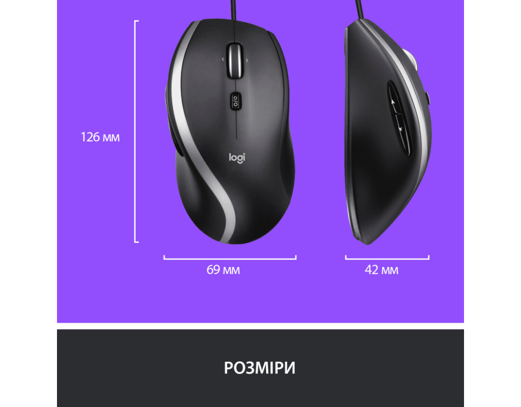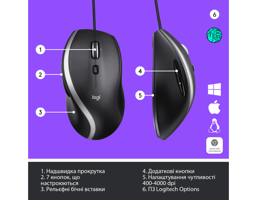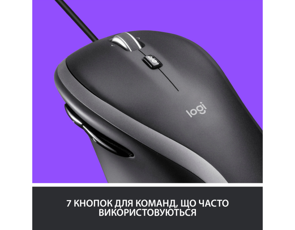 | Мишка Logitech M500s Advanced (910-005784) - еталон якості і зручності в світі комп'ютерної периферії. Ця повнорозмірна миша з оригінальним дизайном ідеально підходить для використання у професійній діяльності та для домашнього використання, пропонуючи максимально комфортну роботу завдяки своїй ергономічній формі. Підключення здійснюється за допомогою надійного дротового інтерфейсу через порт USB, що забезпечує стабільний зв'язок без жодних затримок. Миша оснащена лазерним датчиком з регульованою роздільною здатністю до 4000 dpi, що гарантує точність та швидкість переміщення курсора на будь-якій поверхні. Це дозволяє легко налаштувати сенситивність відповідно до потреб користувача та вимог конкретних задач. Однією з унікальних особливостей M500s є надшвидка прокрутка. Інноваційне коліщатко прокрутки дозволяє миттєво переглянути великі документи та веб-сторінки. Ви можете обирати між безперервною або покроковою прокруткою в залежності від ситуації, що забезпечує максимальний контроль та точність. Ваша продуктивність досягне нових висот завдяки сімом налаштованим кнопкам, які можна конфігурувати для виконання певних функцій через ПО Logitech OPTIONS. Це дозволяє персоналізувати ваші робочі процеси, надаючи швидкий доступ до найчастіше використовуваних команд, наприклад, копіювання та вставки тексту, навігації між веб-сторінками та багато іншого. Довжина кабеля становить 1.8 метра, що створює додаткову свободу рухів без необхідності триматися близько до комп'ютера. Миша виконана в стильному чорному кольорі з м'якими гумовими бічними вставками, які посилюють відчуття зручності навіть під час тривалого використання. Завдяки технології Plug-and-Play, миша готова до роботи одразу після підключення до комп'ютера. Немає необхідності встановлювати драйвери або витрачати час на налаштування - просто підключіть та починайте працювати. Logitech M500s Advanced - це невід'ємний помічник для тих, хто цінує якість, ефективність та інноваційні рішення у своїх гаджетах. |