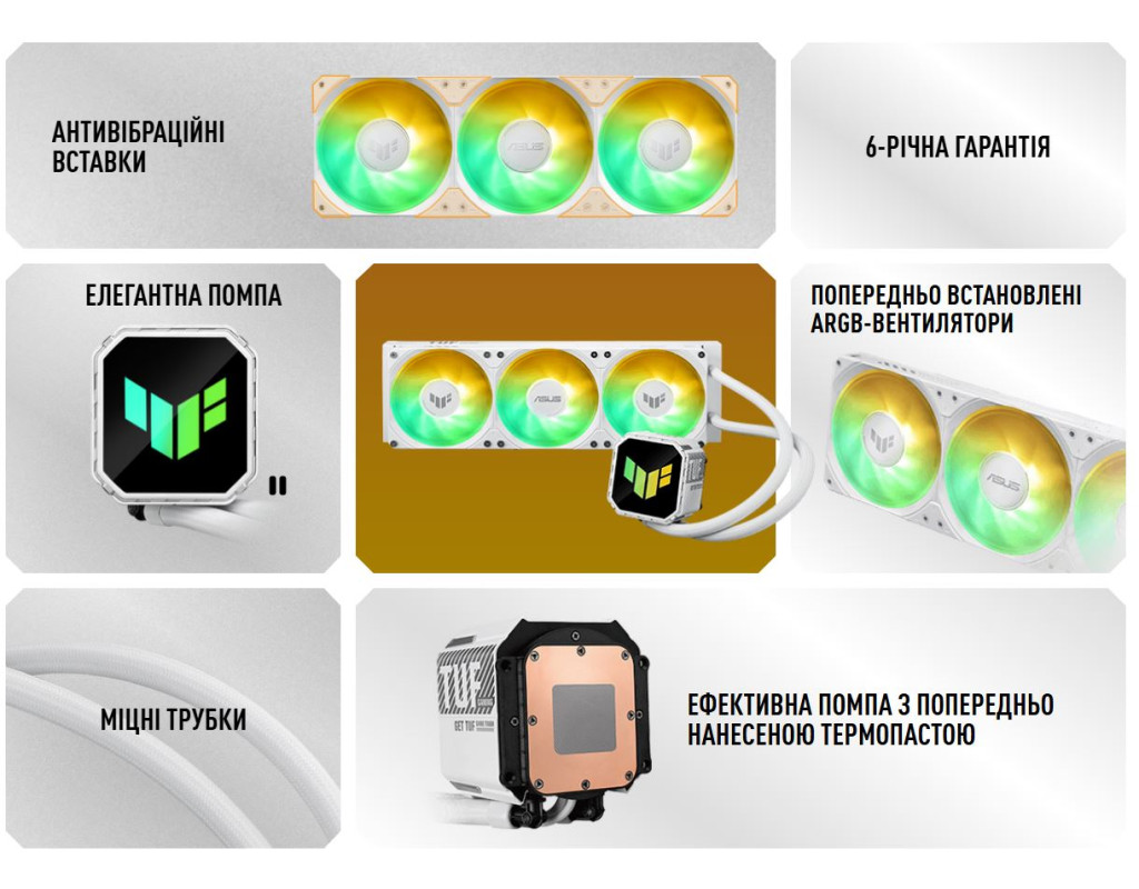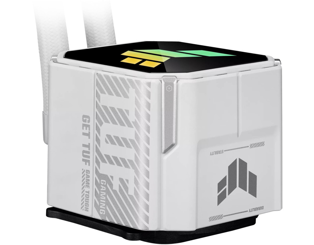 | TUF Gaming LC III 360 ARGB White Edition – необслуговувана рідинна система охолодження процесора з трьома попередньо встановленими вентиляторами для створення високого повітряного потоку й статичного тиску та високоефективною помпою, що забезпечує оптимальну робочу температуру процесора.