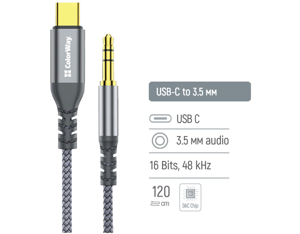 Адаптер ColorWay USB-C to 3.5 мм дозволяє підключати навушники, автомобільні аудіосистеми, колонки та інші пристрої з AUX-входом 3.5 мм до смартфонів, планшетів та інших гаджетів із портом USB-C. Ідеальне рішення для якісного відтворення аудіо без втрати звуку. Особливості: - Вбудований DAC-чіп для чистого стереозвуку високої якості (16 біт / 48 кГц).