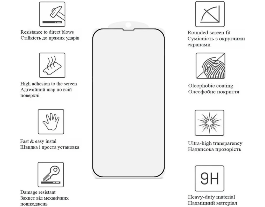- Завдяки високоточній технології виготовлення, покриття не впливає на яскравість, чутливість та передачу кольору дисплея.