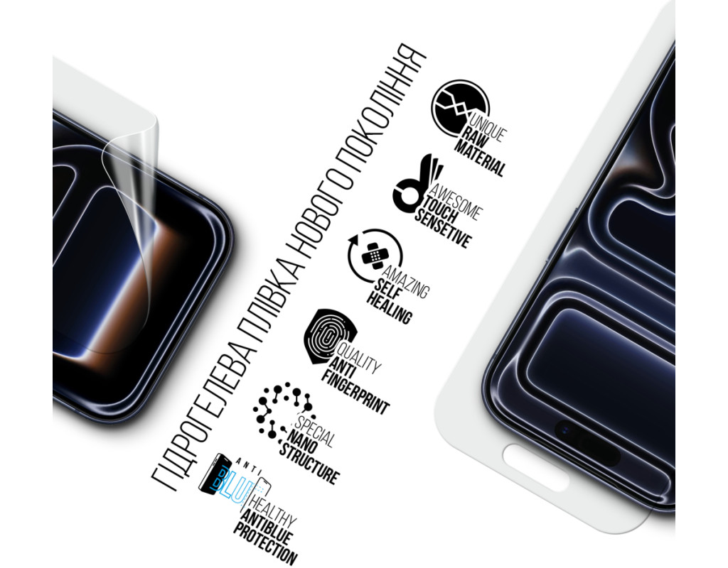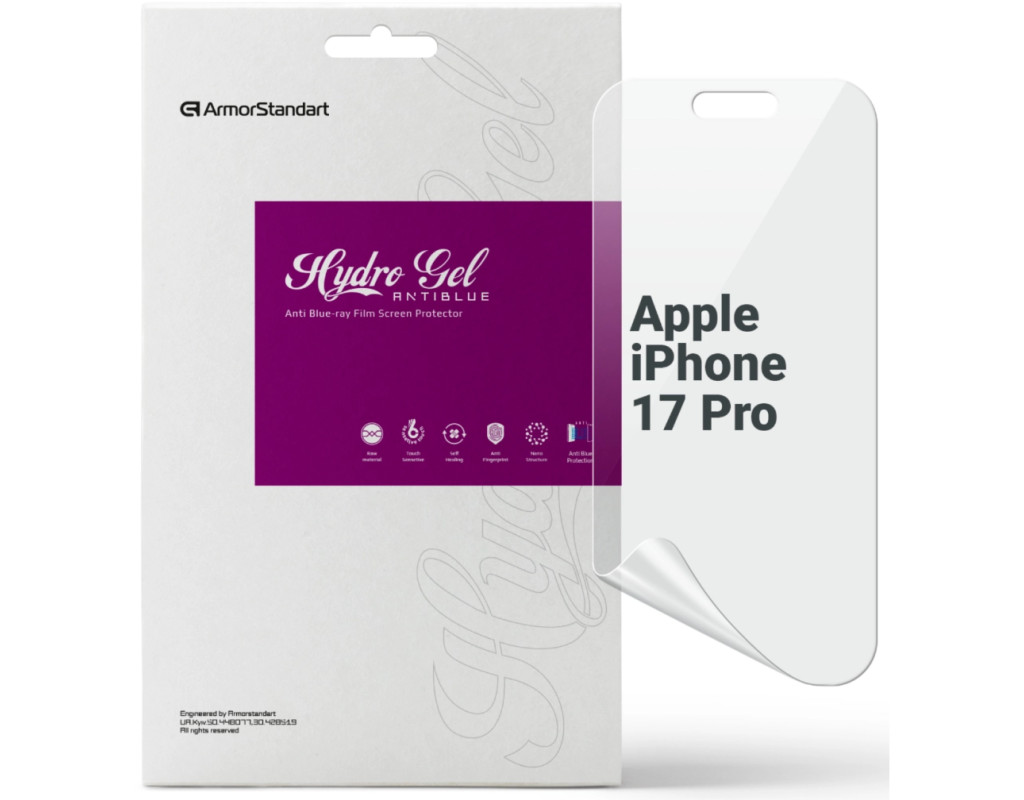 Призначення - для телефону, Вид покриття - гідрогелева, Сумісність з моделями - Apple iPhone 17 Pro, Підходить для телефонів з діагоналлю - 6.3", Особливості - Anti-Blue Light, Кількість в упаковці - 1 шт