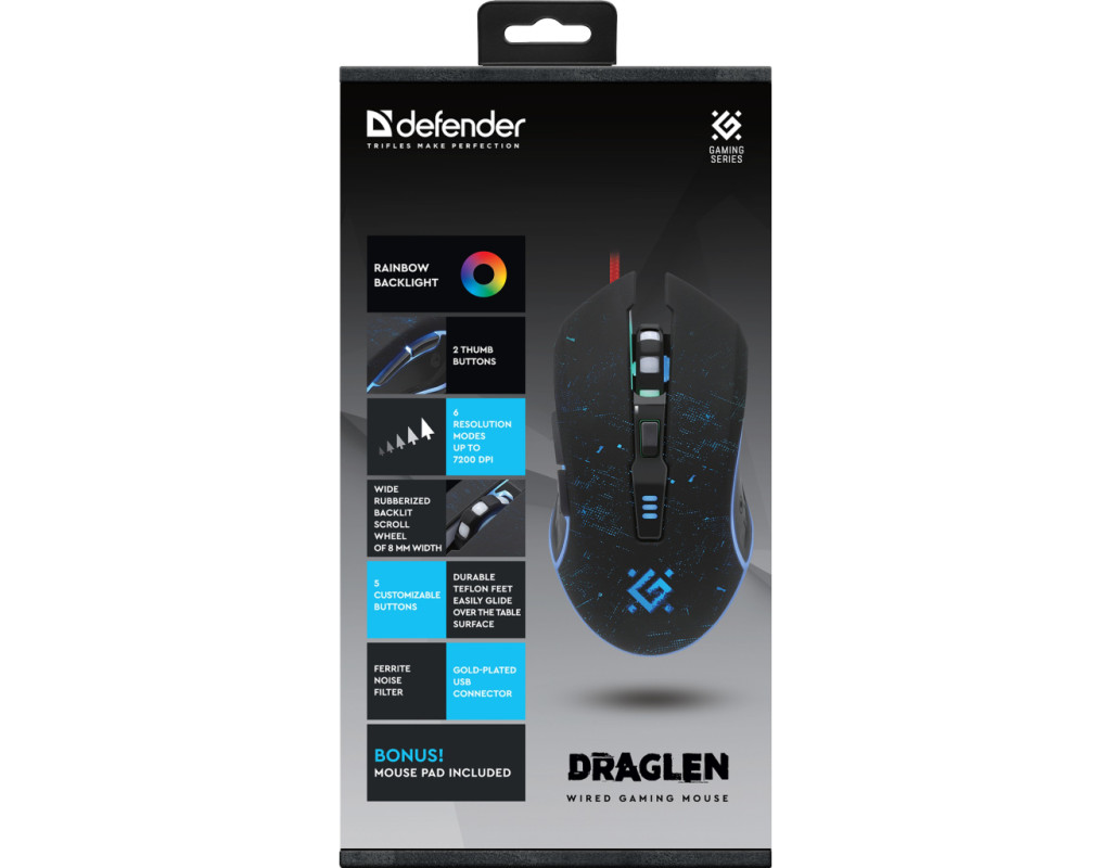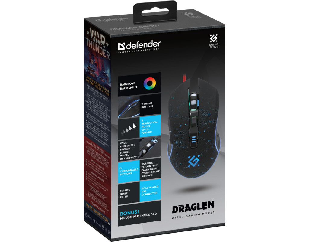 | Мишка Defender Draglen GM-907 RGB USB Black (52907) — ідеальний вибір для геймерів, яким важлива швидкість реакції, точність та комфорт під час тривалих ігрових сесій. Цей пристрій поєднує в собі інноваційні технології та стильний дизайн, що задовольнить навіть найвибагливіших користувачів. Серед головних переваг мишки — веселкове підсвічування, яке не лише додає естетичної привабливості, а й дозволяє створити атмосферу неймовірного занурення у світ гри. Одна з ключових програмних функцій Draglen GM-907 — можливість вибору з 6 режимів роздільної здатності, що досягає 7200 dpi. Це розширення забезпечує еталонну чутливість та керованість курсором, необхідну для динамічних ігор, таких як World of Tanks. Мишка має 5 програмованих кнопок, включаючи 2 додаткові бічні кнопки, які зручно розташовані для швидкого доступу до команд в грі. Завдяки цьому, ви можете налаштувати пристрій відповідно до своїх унікальних потреб та стилю гри. Крім того, широка прогумована колесо прокрутки з підсвічуванням забезпечує максимальний контроль при перегортанні. Для тривалого використання як у змагальних іграх, так і у повсякденних завданнях, мишка оснащена міцними тефлоновими ніжками, що легко ковзають по будь-якій поверхні. Структура кабелю, виконана в плетеному вигляді, підвищує його стійкість до зносів, а феритовий фільтр запобігає перешкодам, що надає стабільність сигналу. Значним плюсом є позолочений USB-конектор, що сприяє поліпшенню якості підключення. Вага 130 г створює оптимальну стабільність і точність рухів, а довжина кабеля 1.5 м дозволяє зручно розміщувати мишку на вашому ігровому просторі. До того ж, мишка постачається з комплектним килимком 220 х 180 х 1.2 мм, що стане приємним бонусом для організації робочого місця. Мишка підтримує Defender Game Center — програмне забезпечення, яке дозволяє ще більше персоналізувати ваш ігровий процес і сумісне з операційною системою Windows. Оберіть Defender Draglen GM-907 для вашого ігрового арсеналу й насолоджуйтеся якісною грою з перевагою над суперниками! |