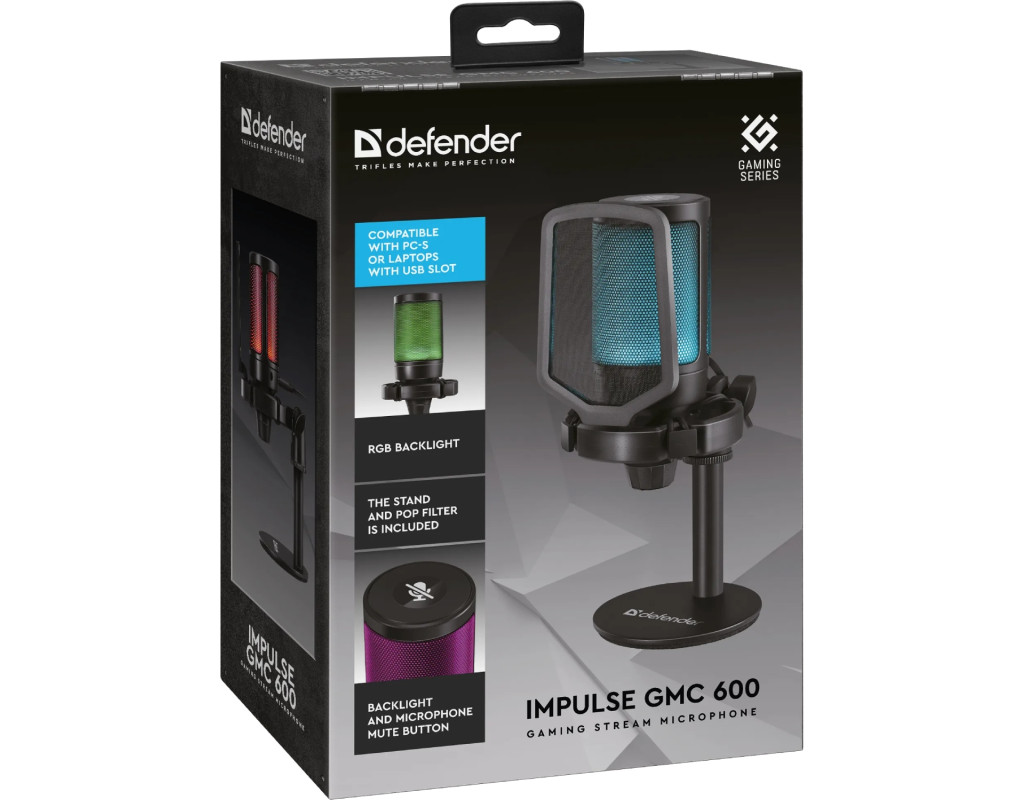Ігровий стрім мікрофон Defender Impulse GMC 600 USB, RGB, 1.8м чорний