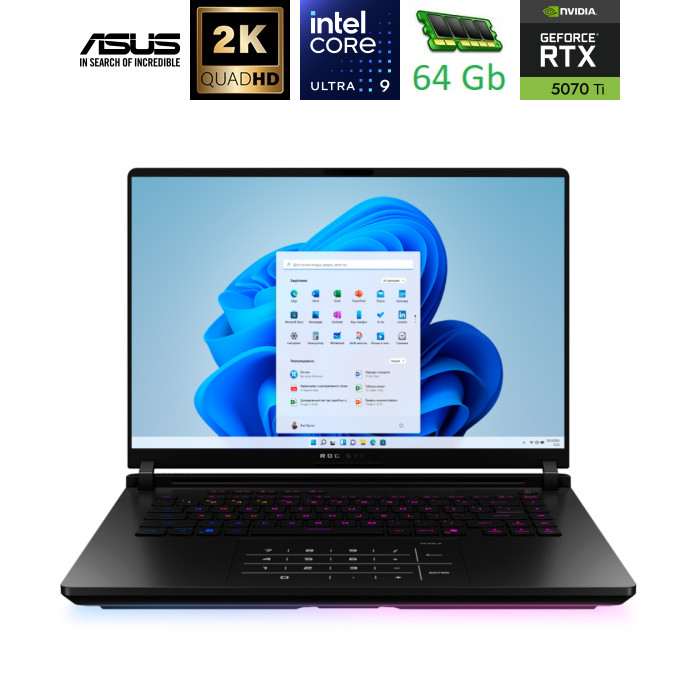 | Швидкість для перемоги Перемагай із процесором Intel Core наступного покоління, відеокартою NVIDIA GeForce RTX для ноутбуків наступного покоління з максимальним TGP 140 Вт. Найкращий із найкращих ROG Strix SCAR 16 2025-го модельного року пропонує найкращі можливості для ігор завдяки процесору Intel Core наступного покоління та відеокарті NVIDIA GeForce RTX для нового покоління з технологією Advanced Optimus. Цей потужний ноутбук може похвалитися оперативної пам’яті DDR5 5600 МГц і SSD-накопичувачами PCIe 4.0. Потужність – на повну! Продуктивність вимагає потужності, тому «мотор» SCAR 16 розігнано до максимуму! У режимі Turbo максимальний TDP процесора складає 55 Вт для CPU, а TGP відеокарти – неймовірні 140 Вт. Для тих, хто бажає попрацювати в режимі Manual, є ще 10 Вт для процесора, а загальний ліміт потужності системи становить 240 Вт. Незалежно від того, які ігри ти любиш, чиста потужність Strix SCAR 16 дасть тобі перевагу над суперниками. Панівна сила Грай на найвищому рівні, спираючись на потужність процесора Intel Core наступного покоління. Завдяки восьми продуктивним і 16 енергоефективним ядрам цей новітній процесор забезпечує високу частоту кадрів у кіберспортивних та ААА-іграх. SCAR 18 також використовує апаратні засоби прискорення штучного інтелекту в окремих застосунках для створення контенту, що дає неймовірну гнучкість у використанні цього ігрового комп’ютера. Графіка нового покоління Для потужних ігрових машин потрібна потужна відеокарта, тому SCAR 16 оснащено відеокартою NVIDIA GeForce RTX для ноутбуків наступного покоління. Завдяки максимальному TGP 140 Вт з технологією Dynamic Boost, підтримці Advanced Optimus і доступу до новітніх інструментів прискорення ШІ, зокрема DLSS і Frame Generation, ця відеокарта здатна підняти якість гри на небачені раніше висоти. NVIDIA Advanced Optimus За допомогою технології NVIDIA Advanced Optimus ноутбук може автоматично вмикати мультиплексор MUX Switch, щоб передавати складені дискретною відеокартою кадри безпосередньо на дисплей, обходячи інтегроване графічне ядро. Такий спосіб передачі підвищує швидкодію на 5–10% порівняно з пристроями без MUX Switch, що забезпечує найкомфортніші відчуття від ігор – і не потребує від вас жодних дій для цього. Крім того, ця технологія заощаджує заряд акумулятора, оскільки може автоматично перемикатися з використання дискретної відеокарти, що споживає багато енергії, на більш економну вбудовану. Чи би ви не займалися, пристрій самостійно перейде в оптимальний режим роботи – вам не потрібно для цього нічого роботи. Ідеальний піт-стоп Для того, щоб зробити апгрейд нового Strix SCAR 16 простішим, ніж будь-коли, його дизайн було повністю перероблено. Нова конструкція корпусу не потребує інструментів для доступу до оперативної пам’яті, твердотільних накопичувачів і вентиляторів, а для слотів SSD використовується новітня система фіксації Q-latch. Подібно до механіка досвідченої бригади, що працює на піт-лейн, ти можеш за лічені секунди вилучити й замінити SSD та модулі оперативної пам'яті, і машина знову запрацює, не пропустивши жодного кола. Спеціальна рамка закриває решту материнської плати для захисту інших компонентів, але її можна легко зняти вилучивши декілька гвинтів, якщо потрібно виконати подальші роботи. Охолодження Strix SCAR 16 2025-го року отримав повністю оновлену систему охолодження, під час створення якої були виконані численні розрахунки, щоб гарантувати найкращі ігрові враження ві