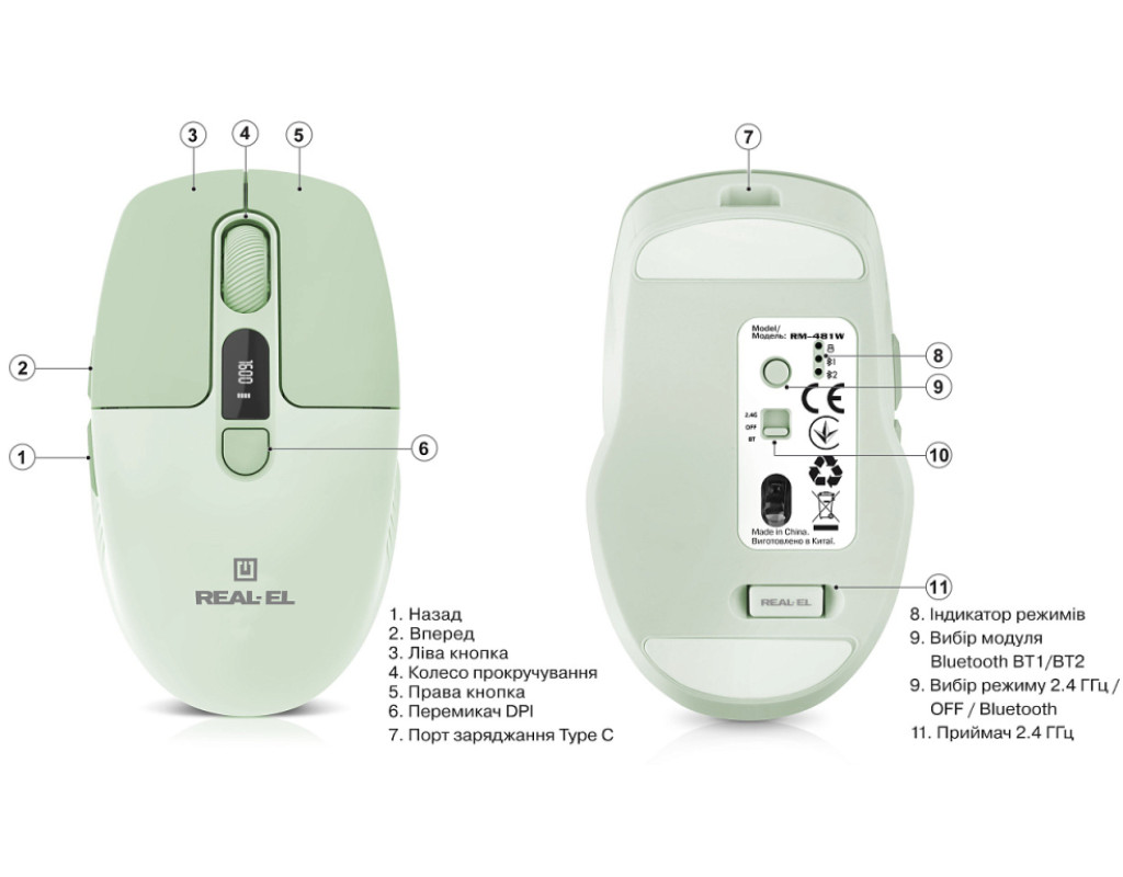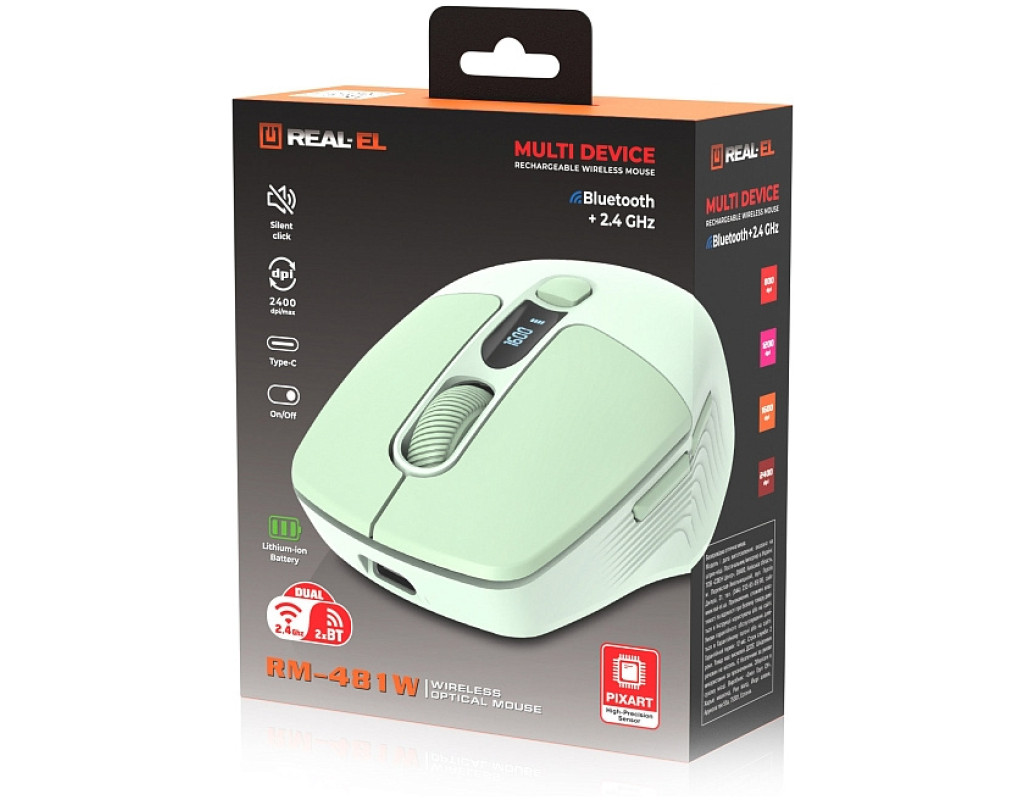 | Мишка REAL-EL RM-481W (EL123200060) — це еталон сучасного підходу до функціональності та дизайну. Завдяки лаконічному та стильному зовнішньому вигляду ця бездротова миша гармонійно вписується у будь-яке робоче середовище, забезпечуючи комфорт та ефективність під час роботи, навчання або розваг. Її ергономічна форма разом з безшумними кнопками роблять користування максимально приємним. Інформативний LED-дисплей — одна з ключових особливостей цієї моделі. Екран відображає рівень заряду акумулятора та обрану чутливість сенсора, що позбавляє користувача необхідності встановлювати додаткове програмне забезпечення. Це суттєво підвищує зручність у щоденному користуванні, надаючи можливість контролювати основні параметри просто й швидко. Три режими підключення (бездротовий режим 2.4 ГГц, два незалежні режими Bluetooth) роблять REAL-EL RM-481W надзвичайно універсальною. Ви зможете легко перемикатися між різними пристроями, використовуючи мишку з ноутбуками, ПК, планшетами й смартфонами на платформах Windows, macOS, Android та iOS. Стабільність з’єднання на відстані до 10 метрів гарантує безперервну роботу, незалежно від обраного пристрою. Висока точність і плавність керування забезпечується за рахунок оптичного сенсора з регульованою роздільною здатністю (800, 1200, 1600 та 2400 DPI). Ця можливість робить мишку ідеальною для виконання будь-яких завдань, починаючи від повсякденної офісної роботи і закінчуючи динамічними іграми, адже ви завжди можете налаштувати чутливість під свої потреби. Конструкція миші, що важить усього 65 грамів, у поєднанні з ергономічною формою дозволяє уникнути втоми навіть при тривалому використанні. Вбудована літій-іонна акумуляторна батарея ємністю 400 мА*год забезпечує тривалий час автономної роботи. Завдяки сучасному порту USB Type-C ви зможете заряджати мишку, не перериваючи робочий процес. Мишка REAL-EL RM-481W пропонує комфорт, надійність та високу продуктивність, що робить її незамінним інструментом для будь-якого сучасного користувача, що цінує зручність і якість. Вибираючи цю модель, ви отримаєте пристрій, здатний задовольнити найвибагливіші вимоги. |
