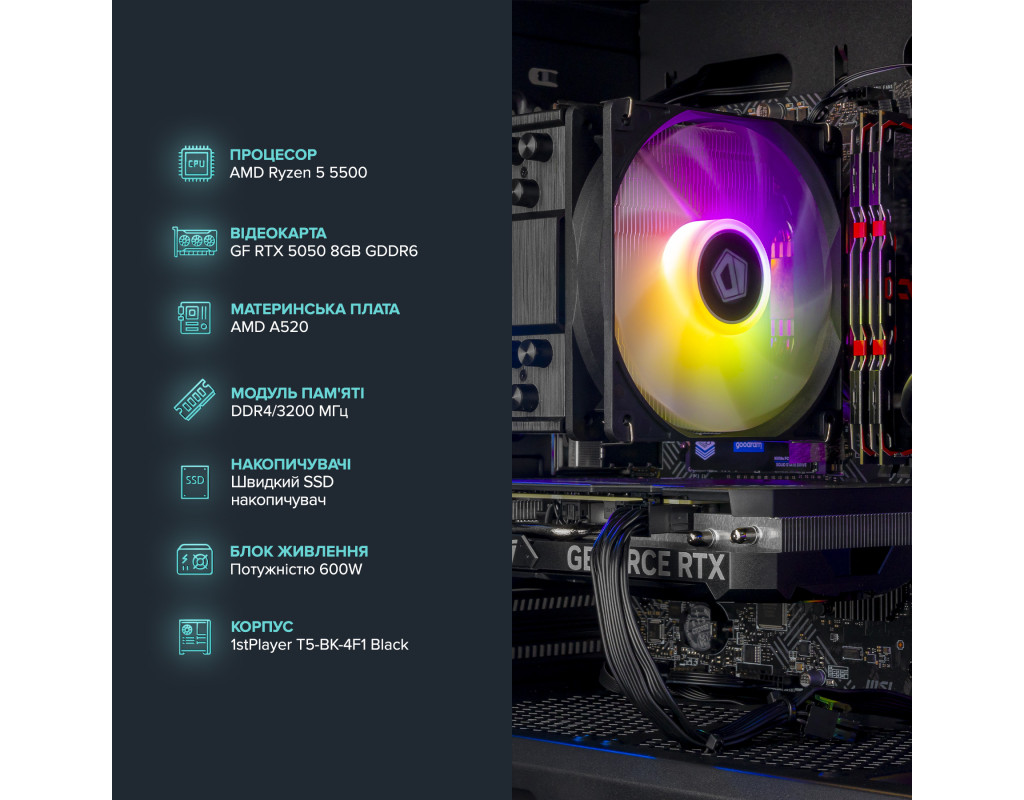 Персональний комп`ютер ASGARD (A55.16.S10.55.6773); AMD Ryzen 5 5500 (3.6 - 4.2 ГГц) / ОЗП 16 ГБ / SSD 1 ТБ / NVIDIA GeForce RTX 5050 8 ГБ / без ОП / LAN / без ОС / чорний