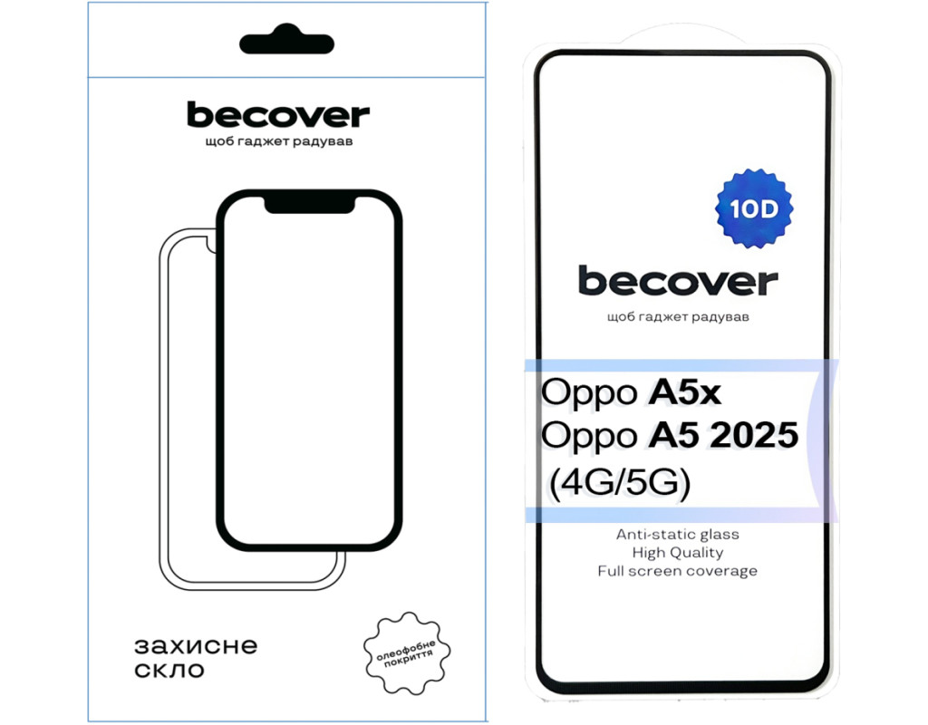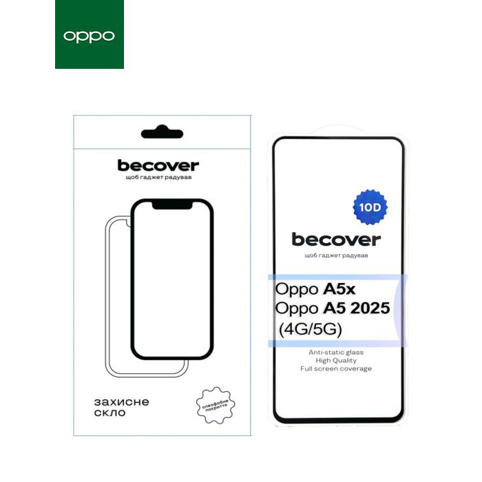 Призначення - для телефону, Вид покриття - глянсове, Сумісність з моделями - OPPO A5X, Oppo A5 2025, Підходить для телефонів з діагоналлю - 6.67", Особливості - з рамкой, Спосіб наклеювання - на клейкій основі, Кількість в упаковці - 1 шт