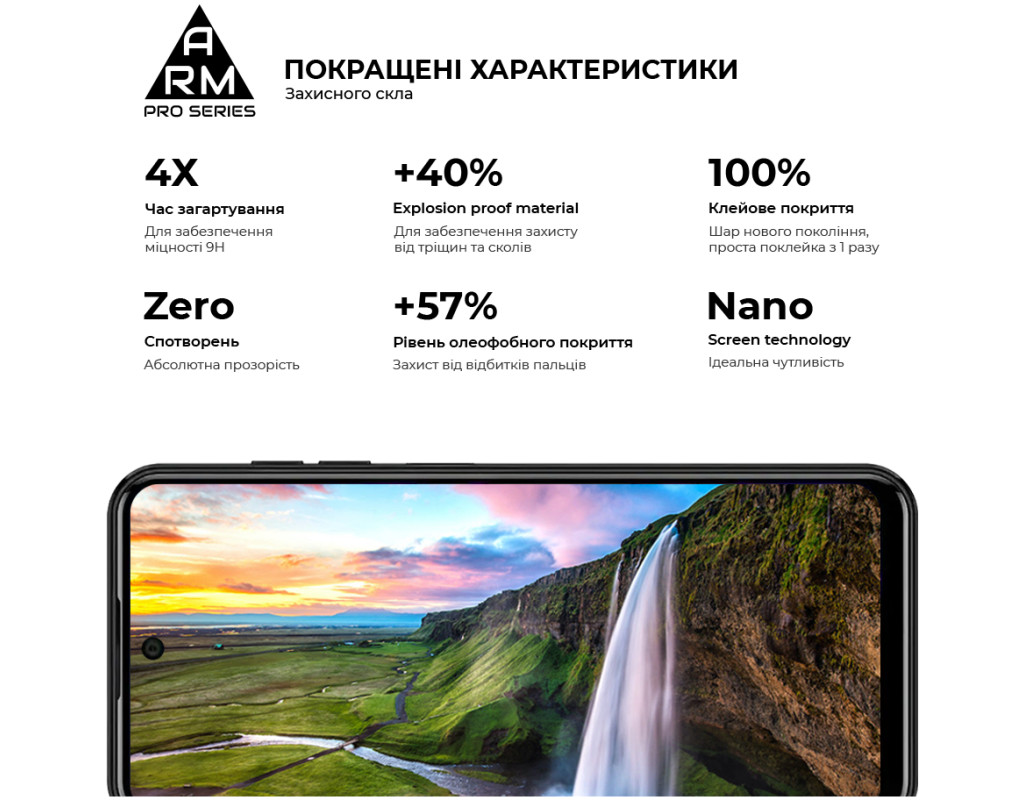 - Верхня частина скла містить покращене олеофобне й гідрофобне покриття. Під час використання скла це забезпечує природні тактильні відчуття - пальці легко ковзають по поверхні. Водночас зображення відбивається з автентичною яскравістю й чіткістю без спотворень.