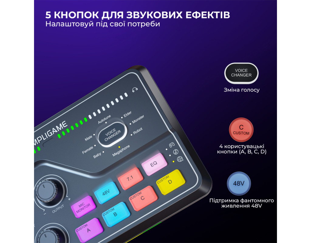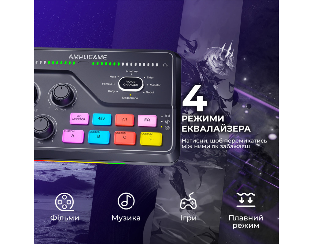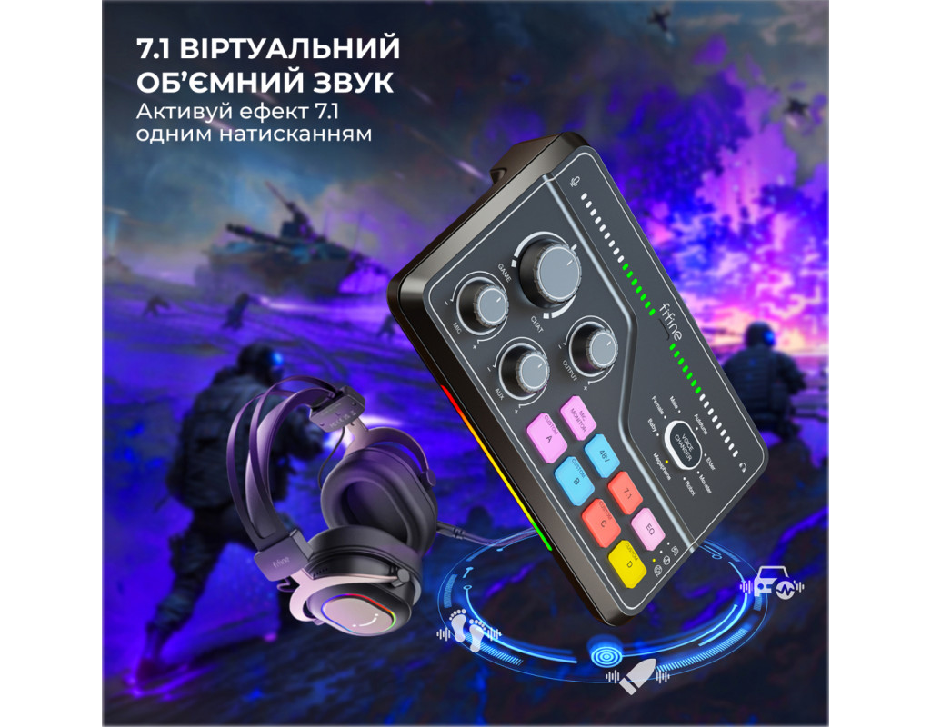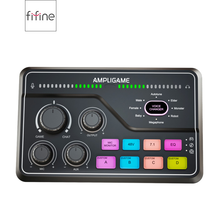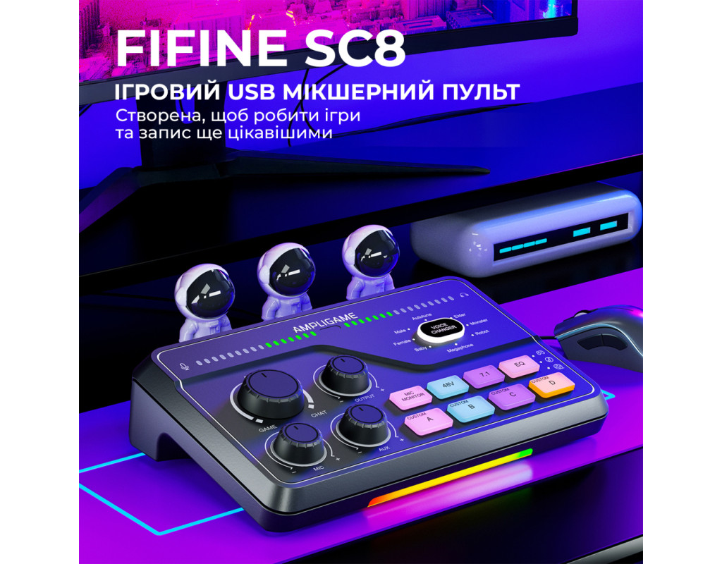 FIFINE AmpliGame SC8 Black сумісний із більшістю мікрофонів завдяки комбо-входу XLR/6.35 мм та фантомному живленню 48 В. Підходить для конденсаторних (наприклад, FIFINE K690, K658, K669C) і динамічних моделей (K688 та інші XLR-мікрофони), а також може використовуватись із інструментами через 6.35 мм вхід. Ігровий USB мікшерний пульт створений, щоб робити ігри та запис цекавішим FIFINE AmpliGame SC8 Black — ігровий USB-мікшерний пульт, створений, щоб зробити ваші стріми та записи цікавішими та професійнішими. Він дозволяє одночасно керувати гучністю гри, голосового чату та мікрофона, забезпечуючи ідеальний баланс звуку без затримок. Завдяки інтуїтивним регуляторам ви можете швидко змінювати рівні, додавати ефекти чи змінювати голос у реальному часі. Це зручне рішення для геймерів, стрімерів і контент-мейкерів, які хочуть повністю контролювати звук і створювати якісний контент без складних налаштувань. Підсвічування Він дозволяє регулювати баланс між грою, голосом і мікрофоном у реальному часі, додаючи ефекти та зміну голосу одним натисканням. Модель вирізняється 15 режимами RGB-підсвічування, серед яких — статичний одноколірний, динамічний багатоколірний градієнт і пульсуючий градієнт. Яскраве підсвічування не лише створює атмосферу, а й робить мікшер стильним елементом вашої геймерської студії. Легке підключення Завдяки універсальному інтерфейсу USB-C мікшер FIFINE AmpliGame SC8 Black забезпечує максимально просте та швидке підключення без потреби у драйверах чи складних налаштуваннях. Просто під’єднайте його до комп’ютера або консолі, і пристрій автоматично розпізнається системою. Мікшер повністю сумісний із ПК, ноутбуками, PlayStation та іншими консолями, що дозволяє зручно перемикатися між платформами залежно від ваших потреб — чи то стрім на ПК, чи ігрова сесія на PS5. 7.1 віртуальний обʼємний звук FIFINE AmpliGame SC8 Black підтримує віртуальний 7.1 об’ємний звук, що забезпечує глибоке занурення у гру чи запис. Ви чітко чуєте напрямок звуків — від кроків до ефектів — отримуючи перевагу в іграх і реалістичне аудіо під час стрімів. Навіть зі звичайними навушниками звук стає просторовим і насиченим. 5 кнопок для звукових ефектів Оснащений 5 кнопками для звукових ефектів, які дозволяють миттєво додавати емоційність і настрій у ваші стріми чи записи. Ви можете призначити улюблені звуки, реакції або мелодії та запускати їх одним натисканням. Це зручно для створення інтерактивного контенту, живих ефірів і подкастів — без потреби у сторонньому софті чи додаткових пристроях. 4 режими еквалайзера Оснащений 4 режимами еквалайзера — ігри, музика, фільми та плавний режим. Кожен з них оптимізує звучання під конкретний сценарій: