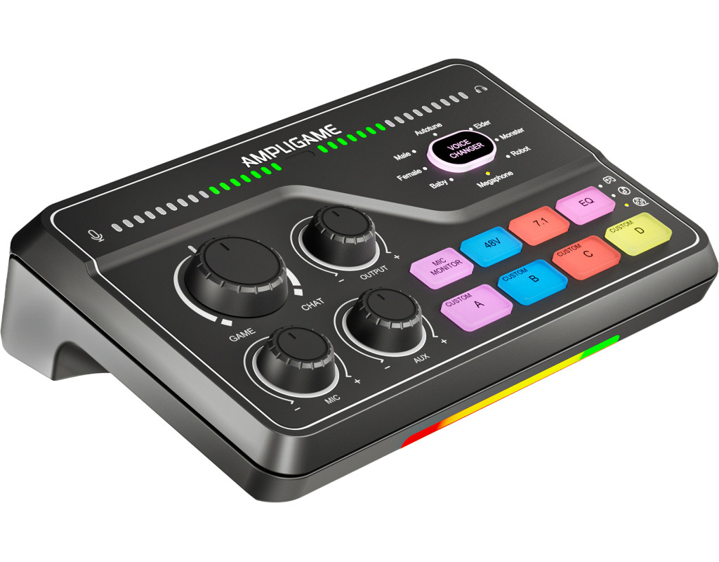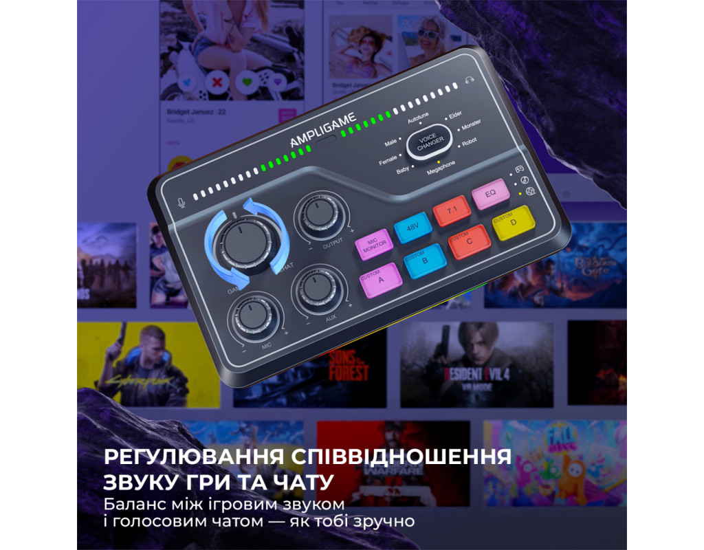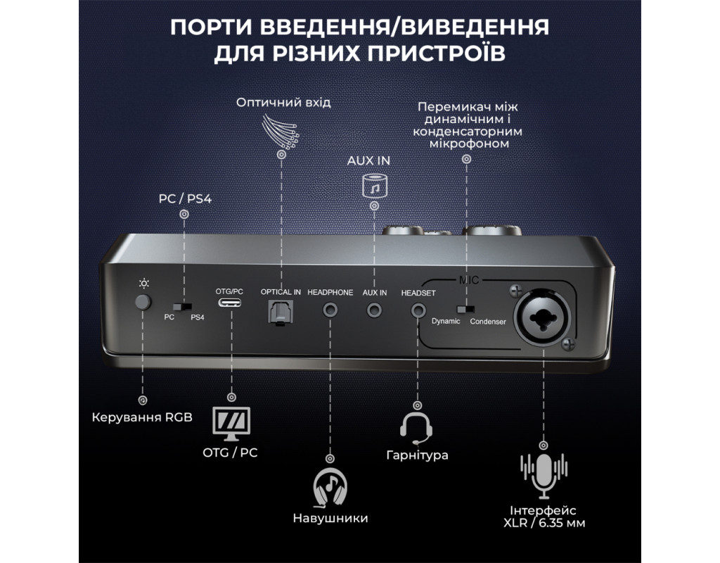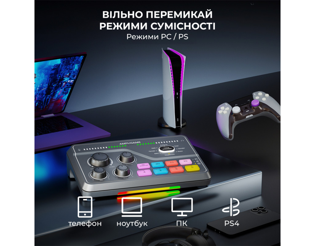 FIFINE AmpliGame SC8 Black сумісний із більшістю мікрофонів завдяки комбо-входу XLR/6.35 мм та фантомному живленню 48 В. Підходить для конденсаторних (наприклад, FIFINE K690, K658, K669C) і динамічних моделей (K688 та інші XLR-мікрофони), а також може використовуватись із інструментами через 6.35 мм вхід. Ігровий USB мікшерний пульт створений, щоб робити ігри та запис цекавішим FIFINE AmpliGame SC8 Black — ігровий USB-мікшерний пульт, створений, щоб зробити ваші стріми та записи цікавішими та професійнішими. Він дозволяє одночасно керувати гучністю гри, голосового чату та мікрофона, забезпечуючи ідеальний баланс звуку без затримок. Завдяки інтуїтивним регуляторам ви можете швидко змінювати рівні, додавати ефекти чи змінювати голос у реальному часі. Це зручне рішення для геймерів, стрімерів і контент-мейкерів, які хочуть повністю контролювати звук і створювати якісний контент без складних налаштувань. Підсвічування Він дозволяє регулювати баланс між грою, голосом і мікрофоном у реальному часі, додаючи ефекти та зміну голосу одним натисканням. Модель вирізняється 15 режимами RGB-підсвічування, серед яких — статичний одноколірний, динамічний багатоколірний градієнт і пульсуючий градієнт. Яскраве підсвічування не лише створює атмосферу, а й робить мікшер стильним елементом вашої геймерської студії. Легке підключення Завдяки універсальному інтерфейсу USB-C мікшер FIFINE AmpliGame SC8 Black забезпечує максимально просте та швидке підключення без потреби у драйверах чи складних налаштуваннях. Просто під’єднайте його до комп’ютера або консолі, і пристрій автоматично розпізнається системою. Мікшер повністю сумісний із ПК, ноутбуками, PlayStation та іншими консолями, що дозволяє зручно перемикатися між платформами залежно від ваших потреб — чи то стрім на ПК, чи ігрова сесія на PS5. 7.1 віртуальний обʼємний звук FIFINE AmpliGame SC8 Black підтримує віртуальний 7.1 об’ємний звук, що забезпечує глибоке занурення у гру чи запис. Ви чітко чуєте напрямок звуків — від кроків до ефектів — отримуючи перевагу в іграх і реалістичне аудіо під час стрімів. Навіть зі звичайними навушниками звук стає просторовим і насиченим. 5 кнопок для звукових ефектів Оснащений 5 кнопками для звукових ефектів, які дозволяють миттєво додавати емоційність і настрій у ваші стріми чи записи. Ви можете призначити улюблені звуки, реакції або мелодії та запускати їх одним натисканням. Це зручно для створення інтерактивного контенту, живих ефірів і подкастів — без потреби у сторонньому софті чи додаткових пристроях. 4 режими еквалайзера Оснащений 4 режимами еквалайзера — ігри, музика, фільми та плавний режим. Кожен з них оптимізує звучання під конкретний сценарій: