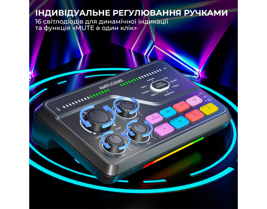 Ці режими дозволяють швидко адаптувати звук під будь-яку ситуацію — від гри до відпочинку. Індивідуальне регулювання ручками Має індивідуальне регулювання ручками для кожного каналу — мікрофона, гри, чату та навушників. Це дозволяє точно налаштувати баланс звуку під свій стиль роботи чи гри. На панелі розташовано 16 світлодіодів для динамічної індикації, які відображають рівень сигналу в реальному часі, додаючи як функціональності, так і візуальної привабливості. Завдяки зручній функції «Mute в один клік» ви можете миттєво вимкнути мікрофон натисканням центральної кнопки — швидко, безшумно і без відволікань під час стріму чи запису. Що в коробці?