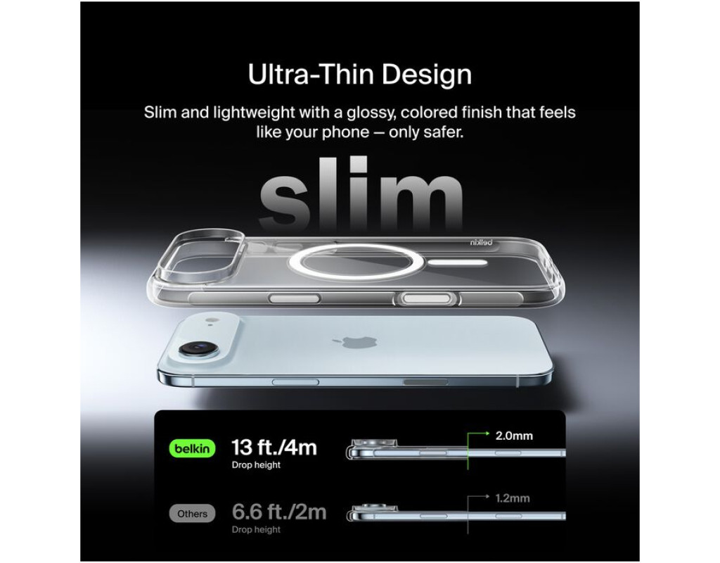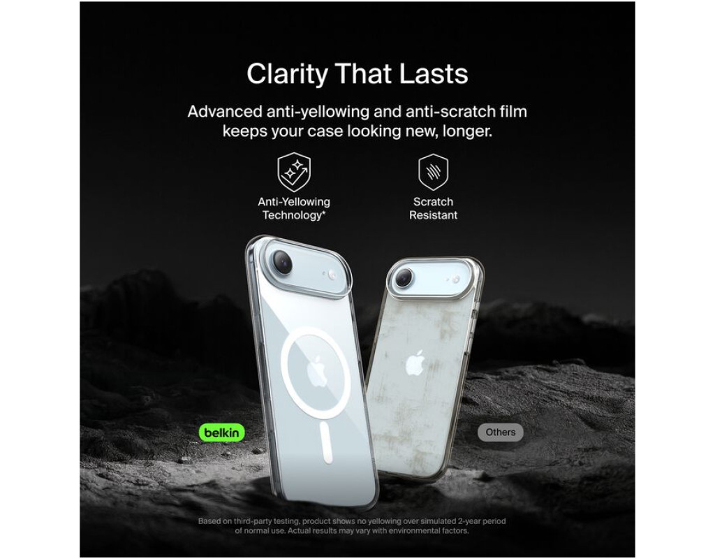 | Чохол Belkin Clear Series для iPhone Air (MSA033HQCL, Clear) — прозорий захист із MagSafe, захистом від падінь до 4 м і протиковзним бампером. Виготовлений із TPU + PC із перероблених матеріалів, має вигнуті краї та поліровані кнопки. Ідеальний для тих, хто хоче зберегти оригінальний вигляд iPhone. |