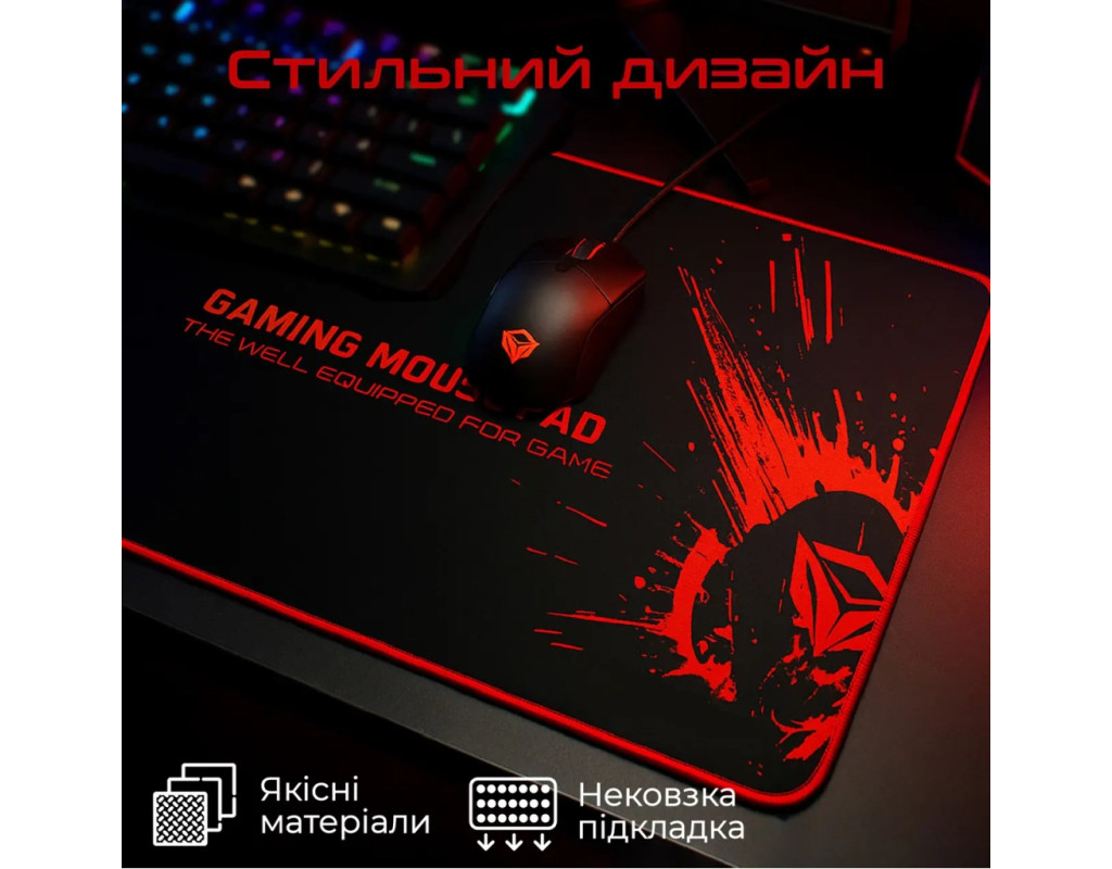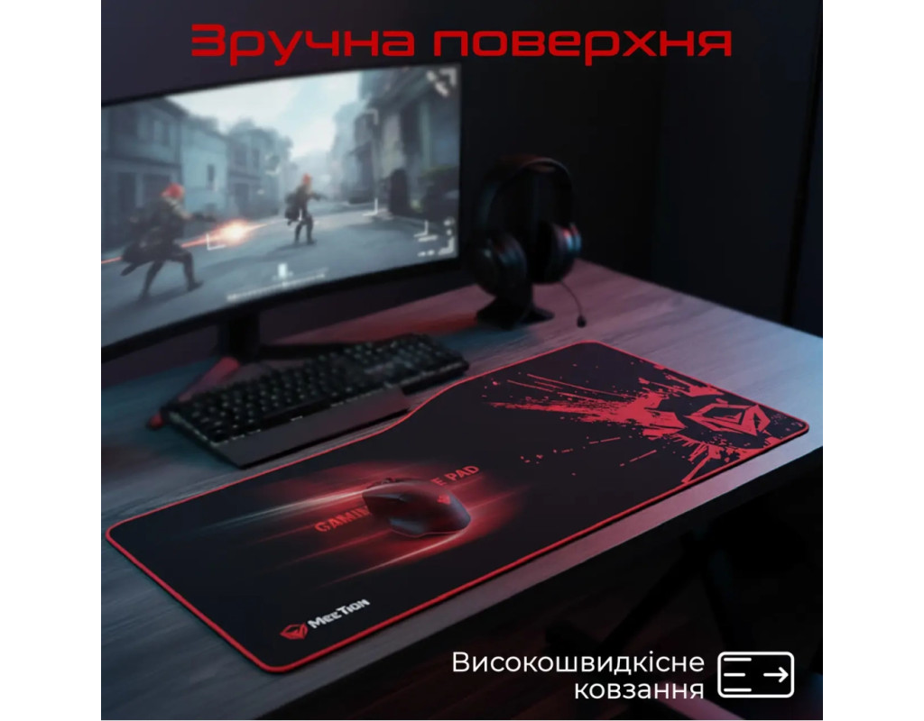 Meetion MT-P100 - ігровий килимок із нековзною гумовою основою та водостійкою поверхнею. Завдяки своєму розміру він забезпечує комфортний простір для точних рухів мишею, а зашиті краї захищають від зношення та продовжують термін служби.