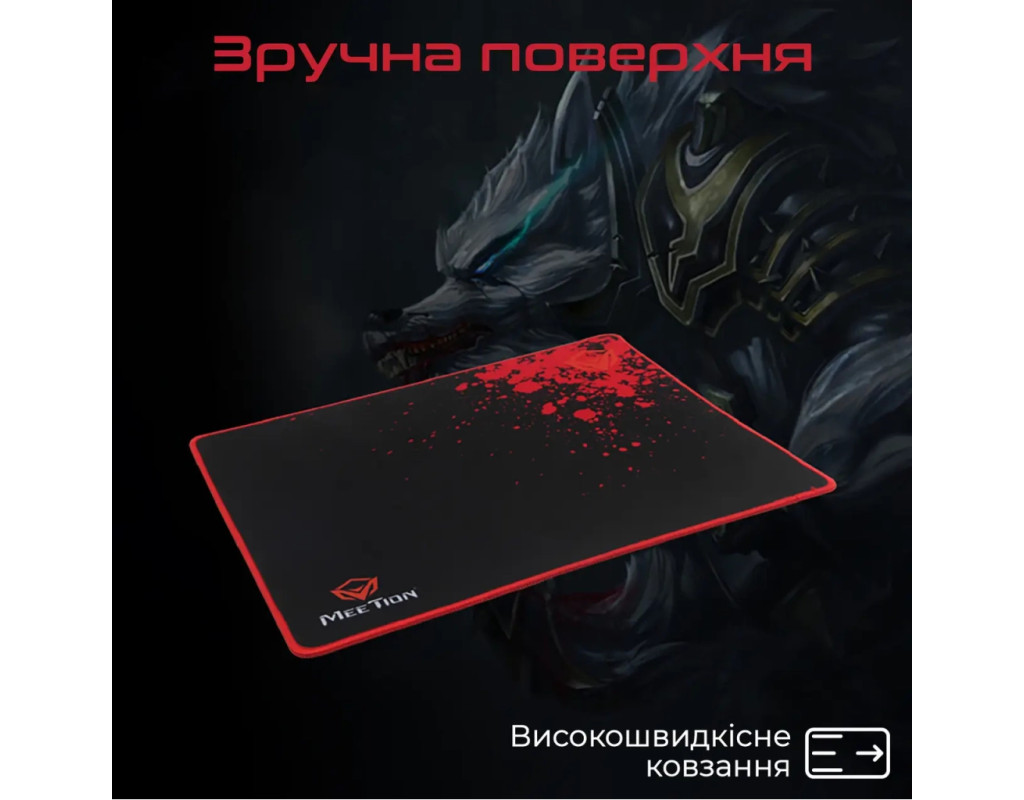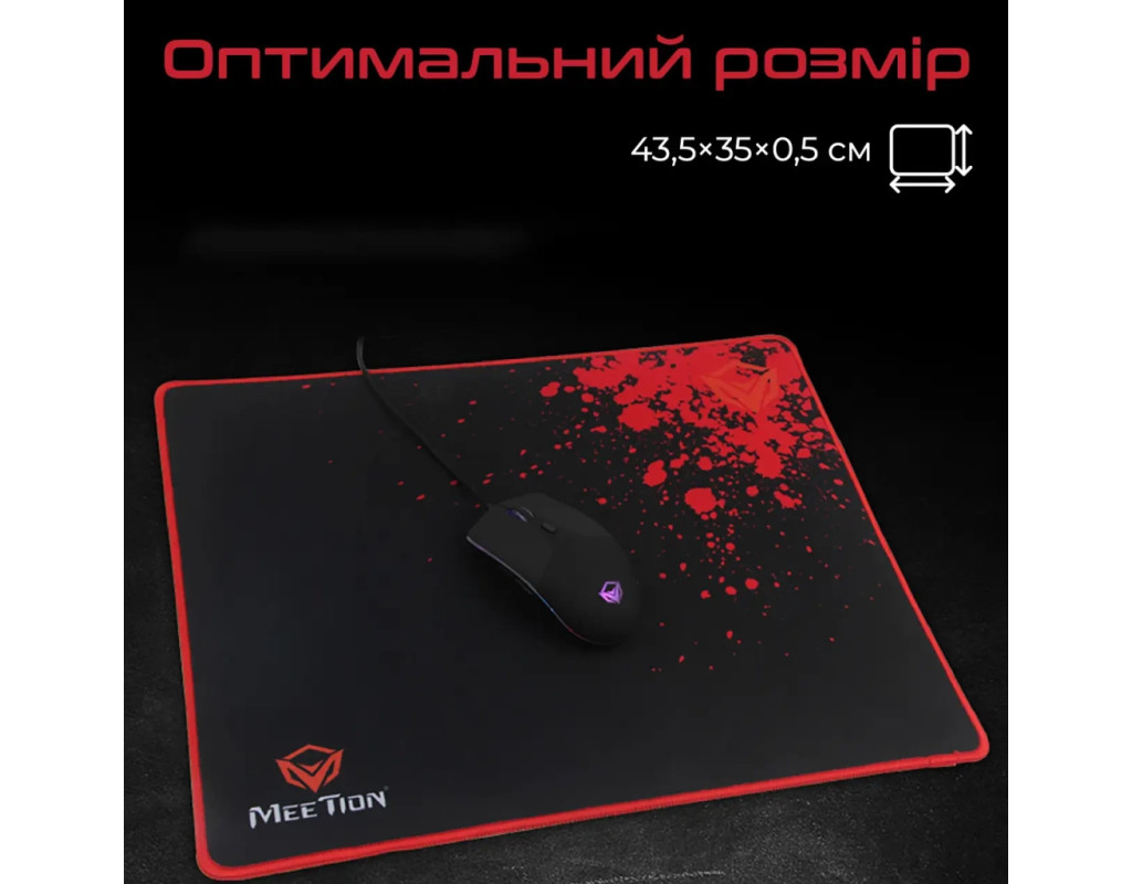 Meetion MT-P110 - ігровий килимок із нековзною гумовою основою та водостійкою поверхнею. Завдяки своєму розміру він забезпечує комфортний простір для точних рухів мишею, а зашиті краї захищають від зношення та продовжують термін служби.