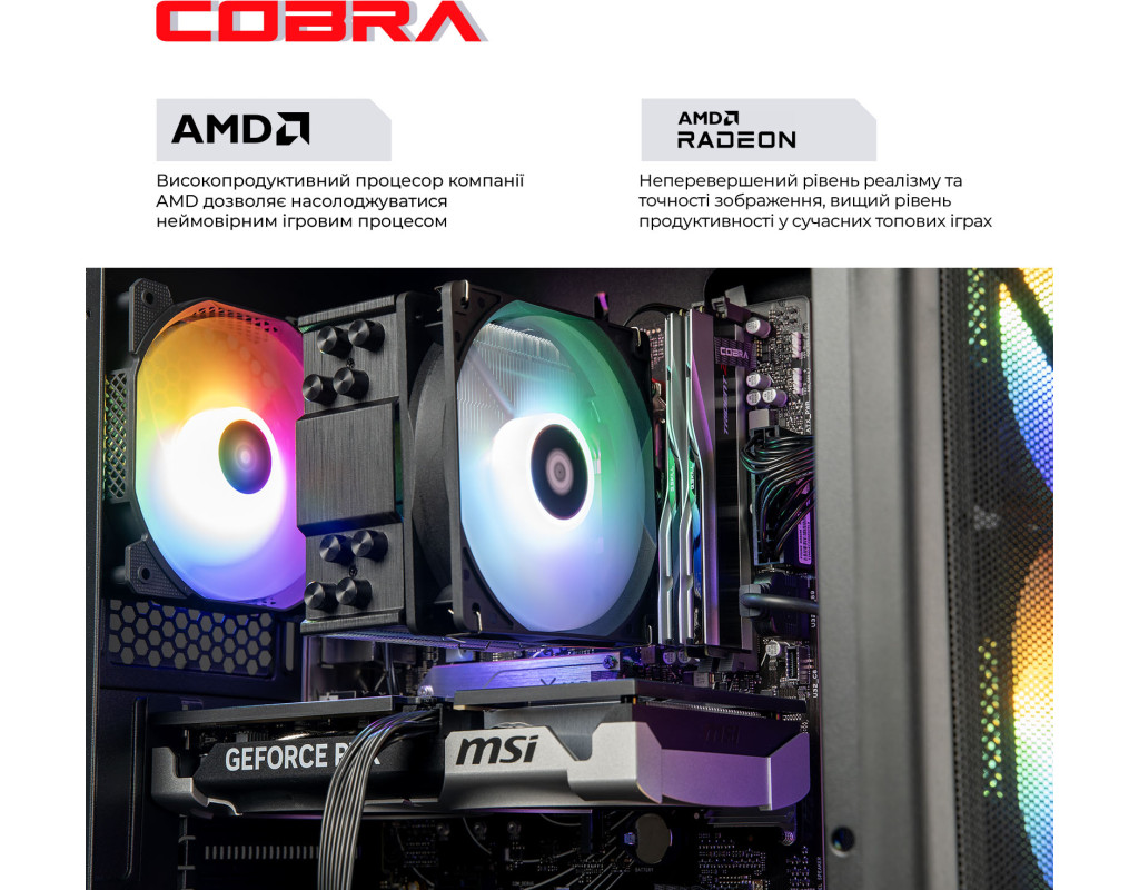 ПК COBRA збираються на базі комплектуючих визнаних світових лідерів, таких як Intel, AMD, MSI, ASUS, Zalman, ProLogix, Seagate, Toshiba, Hitachi, Transcend, Kingston і ін.