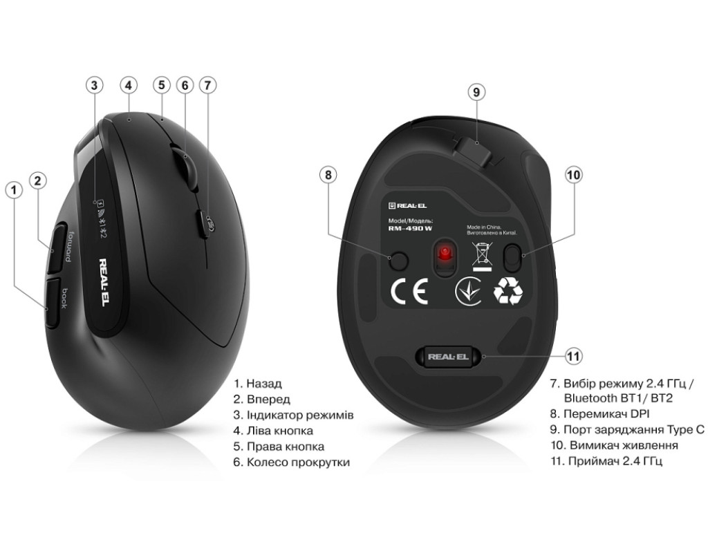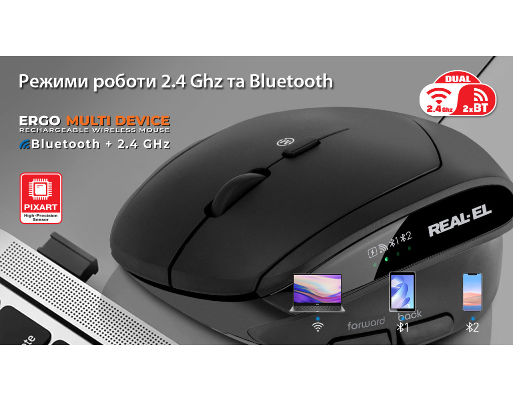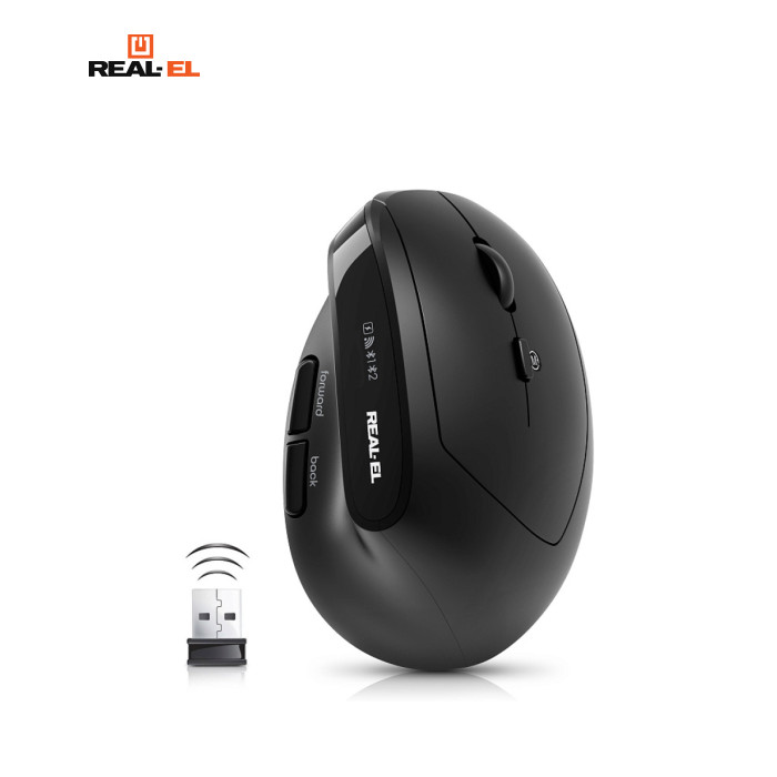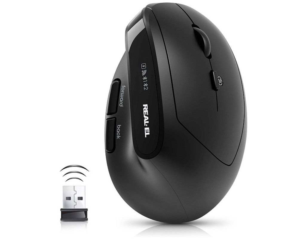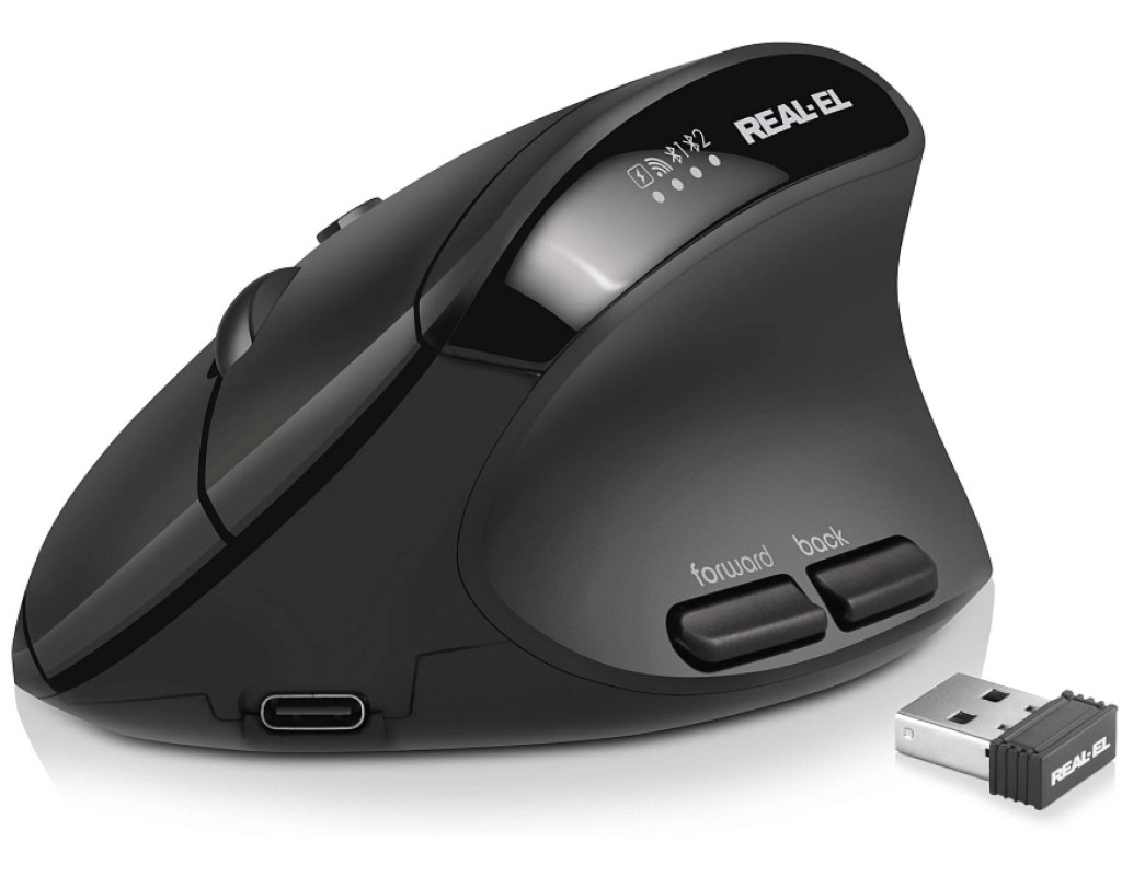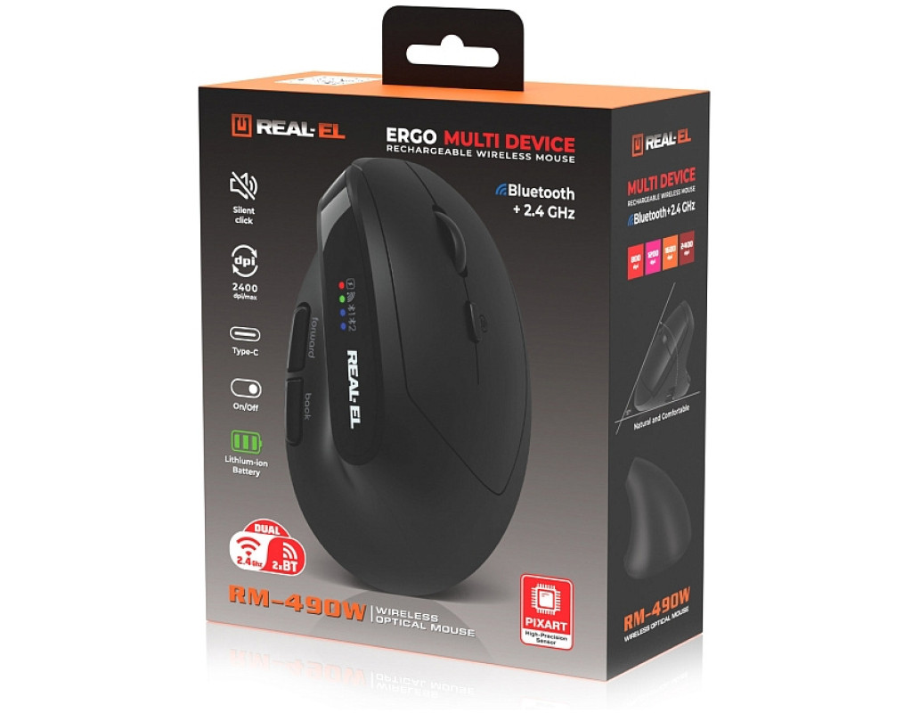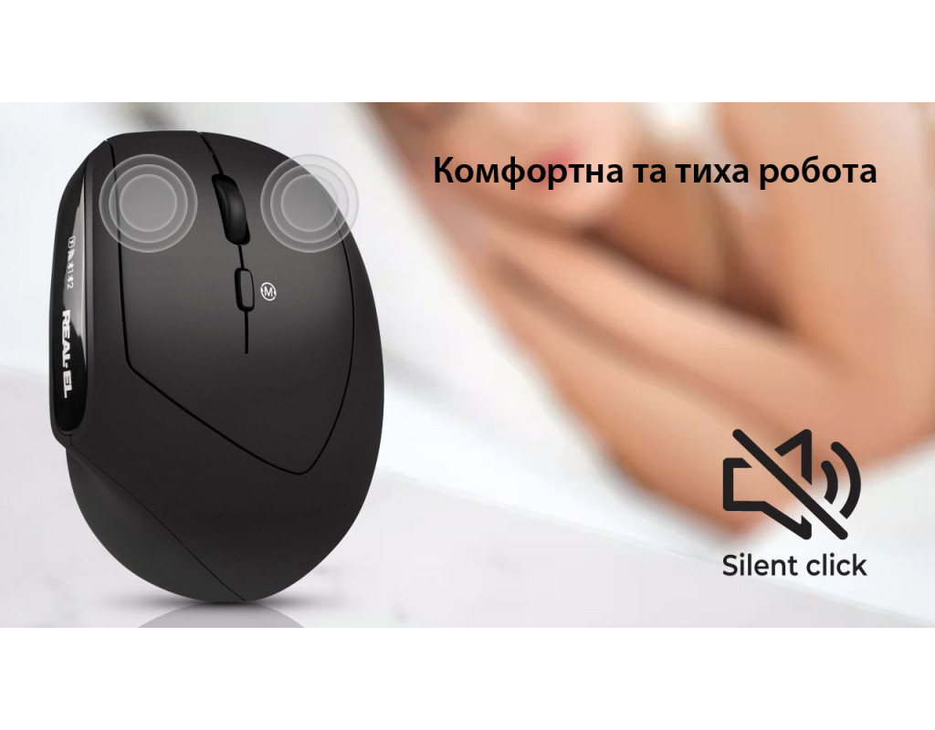 | Мишка REAL-EL RM-490W Wireless/Bluetooth Black (EL123200058) – це вишуканий зразок сучасної техніки, що поєднує в собі зручність, функціональність та елегантний дизайн. Завдяки вертикальному формату, ця миша створює анатомічно правильне положення кисті, допомагаючи зменшити навантаження на зап’ястя під час тривалого використання. Такий конструктивний підхід особливо актуальний для тих, хто проводить багато часу за комп'ютером як вдома, так і в офісі. Універсальність підключення REAL-EL RM-490W забезпечує можливість бездротового з'єднання через Bluetooth, USB-адаптер на 2.4 ГГц, а також сучасний USB Type-C, що розширює спектр сумісних пристроїв для комфортної роботи. Можливість одночасного підключення до трьох різних пристроїв дозволяє легко перемикатися між ними без необхідності повторних налаштувань, зберігаючи надійне з'єднання на відстані до 10 метрів. Тиха робота миші робить її ідеальною для використання у місцях, де важлива тиша – як от в офісах, навчальних просторах або вдома. Безшумні кнопки дозволяють не відволікати вас або оточуючих, створюючи комфортну робочу атмосферу. Високоточний оптичний датчик з максимальним розширенням 2400 dpi та можливістю регулювання чутливості на рівнях 800, 1200, 1600 і 2400 dpi забезпечує бездоганний контроль, який можна адаптувати в залежності від специфіки завдань. Індикатор активного режиму DPI допомагає контролювати обрані налаштування, спрощуючи управління чутливістю під час роботи. ЗРУЧНІСТЬ АВТОНОМНОСТІ: вбудований акумулятор значно підвищує зручність, а індикатор рівня заряду дає змогу вчасно дізнаватися про потребу у підзарядці, що відбувається через порт USB Type-C. Додатковий вимикач живлення дозволяє заощаджувати енергію, коли пристрій не використовується чи транспортується. Основні переваги REAL-EL RM-490W включають комфортність використання завдяки ергономічному дизайну, гнучкість підключення, тихі кнопки, точність і контроль та тривалу автономність. Це робить мишу не лише практичною у повсякденному використанні, а й надійним помічником в питаннях продуктивності та здоров'я ваших рук. |