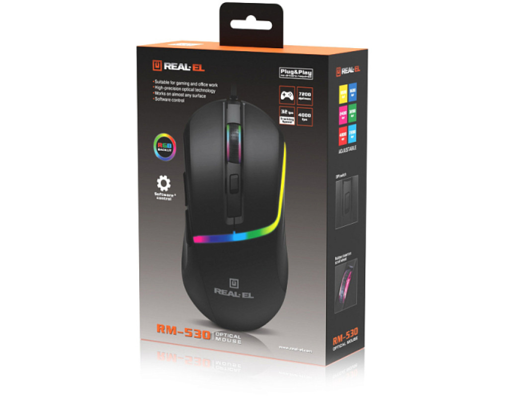 | REAL-EL RM-530 USB Black — це ідеальний вибір для тих, хто цінує якість і функціональність в одному пристрої. Ця оптична мишка розроблена для геймерів, які хочуть мати повний контроль над кожною грою та попереду всіх конкурентів. Її класичний дизайн та ергономічна форма забезпечують максимальний комфорт навіть під час довгих ігрових сесій, запобігаючи втомі рук. REAL-EL RM-530 пропонує користувачам розширені можливості налаштувань завдяки високоточному оптичному сенсору з регульованою роздільною здатністю від 800 до 7200 dpi. Це гарантує точне і стабільне позиціонування, що особливо важливо в динамічних шутерах та інших іграх, де швидкість і точність мають вирішальне значення. Завдяки наявності 6 кнопок, ви отримуєте додатковий контроль, який дозволяє швидше виконувати команди і управляти ігровим процесом. Важливою перевагою REAL-EL RM-530 є її стильний вигляд, підкреслений сучасним RGB-підсвічуванням. Це забезпечує не лише естетичну насолоду, а й дозволяє налаштовувати атмосферу робочого простору відповідно до особистих вподобань. Довжина кабелю 1.8 м дарує свободу рухів, що важливо для забезпечення комфорту під час інтенсивних ігрових моментів. Мишка також підтримує додаткове програмне забезпечення, яке відкриває ще більше можливостей для налаштувань. Ви можете змінювати DPI, перепризначати кнопки, регулювати RGB-підсвічування та створювати унікальні профілі відповідно до різних ігор або сценаріїв використання. Частота в 4000 fps, швидкість стеження 32 ips та прискорення 12G гарантують точну реакцію навіть при різких рухах, роблячи цю мишу відмінним вибором для професійних геймерів. REAL-EL RM-530 є не лише потужним інструментом для геймінгу, але й чудово підходить для роботи та навчання. З її допомогою легко виконувати завдання, що вимагають точності та швидкої реакції. Вага в 76 г і компактні розміри (115 × 62 × 38 мм) роблять цю мишку легкою і зручною у використанні, а чорний колір додасть будь-якому робочому столу стильного вигляду. Оберіть REAL-EL RM-530 USB Black для свого комп’ютера і насолоджуйтесь високою якістю, точністю та швидкістю кожного натискання, пізнаючи нові горизонти у світі технологій і геймінгу. |