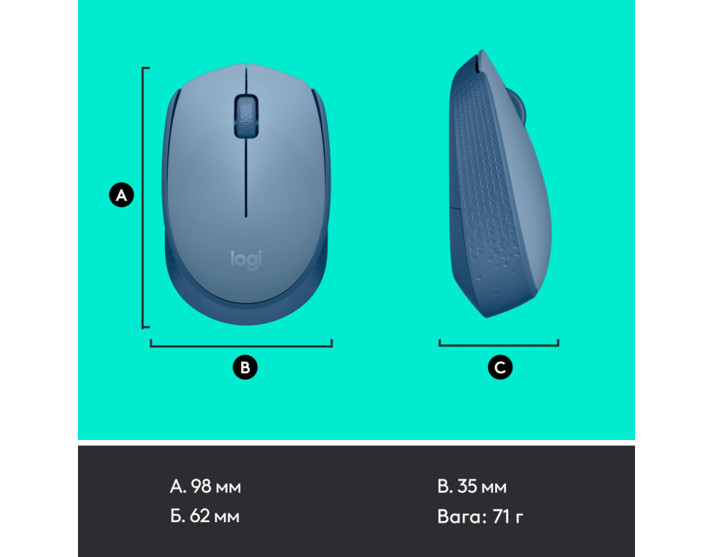 Бездротова миша Logitech M171 поєднує в собі зручність бездротового під'єднання й надійність дротового з'єднання. Завдяки використанню вдосконаленої бездротової технології зв'язку на частоті 2.4 ГГц від Logitech діапазон її дії становить 10 метрів. Ця доступна за ціною миша може працювати до 12 місяців від однієї батареї типу AA. Налаштувати її дуже легко — просто вставте мініатюрний бездротовий приймач в USB-слот. Миша M171 не потребує з'єднання й встановлення програмного забезпечення. Сумісна з операційними системами Windows, Mac і Chrome. Час роботи батареї USB-приймач, який не потребує від'єднання після завершення роботи |