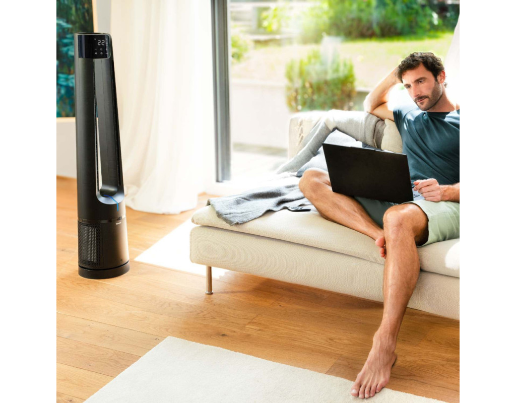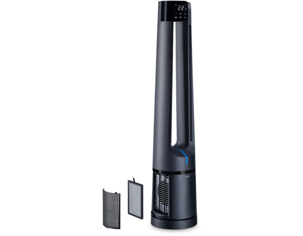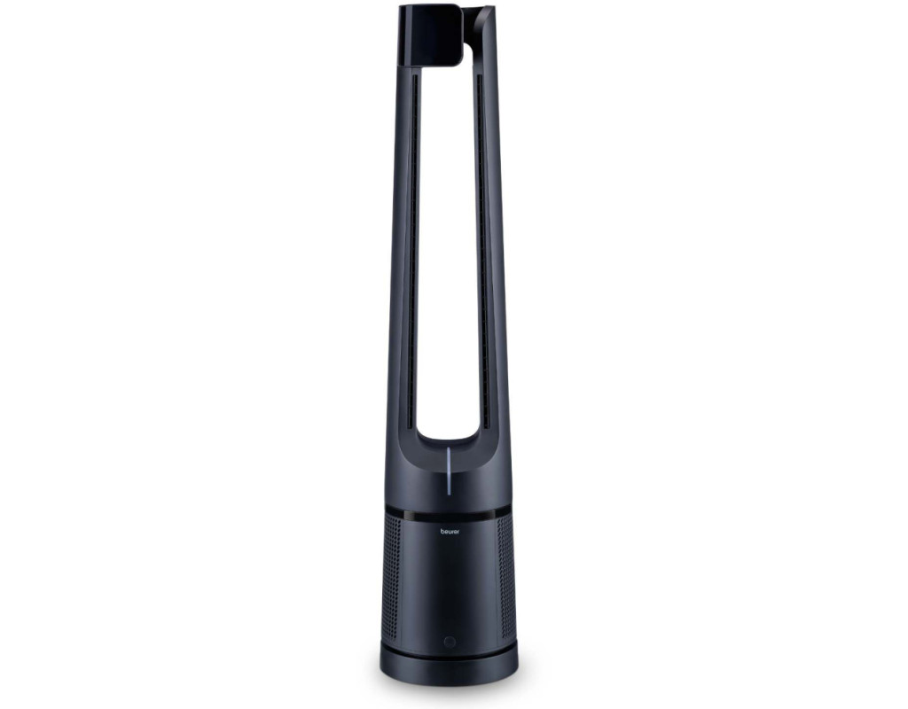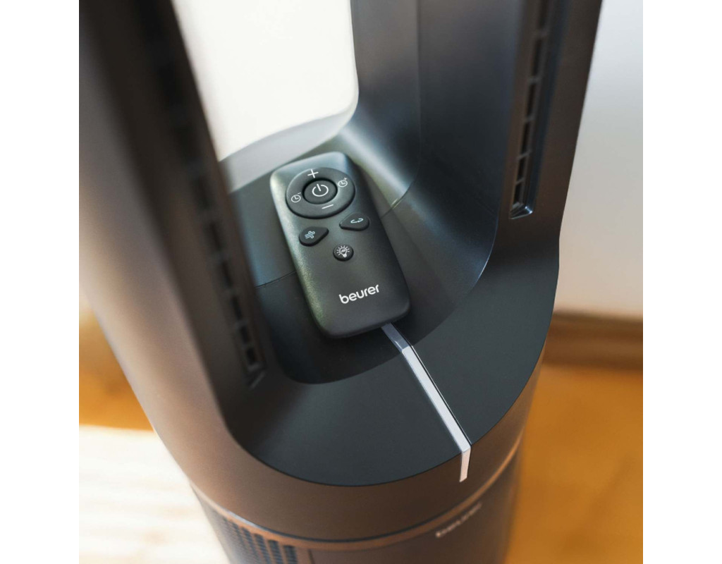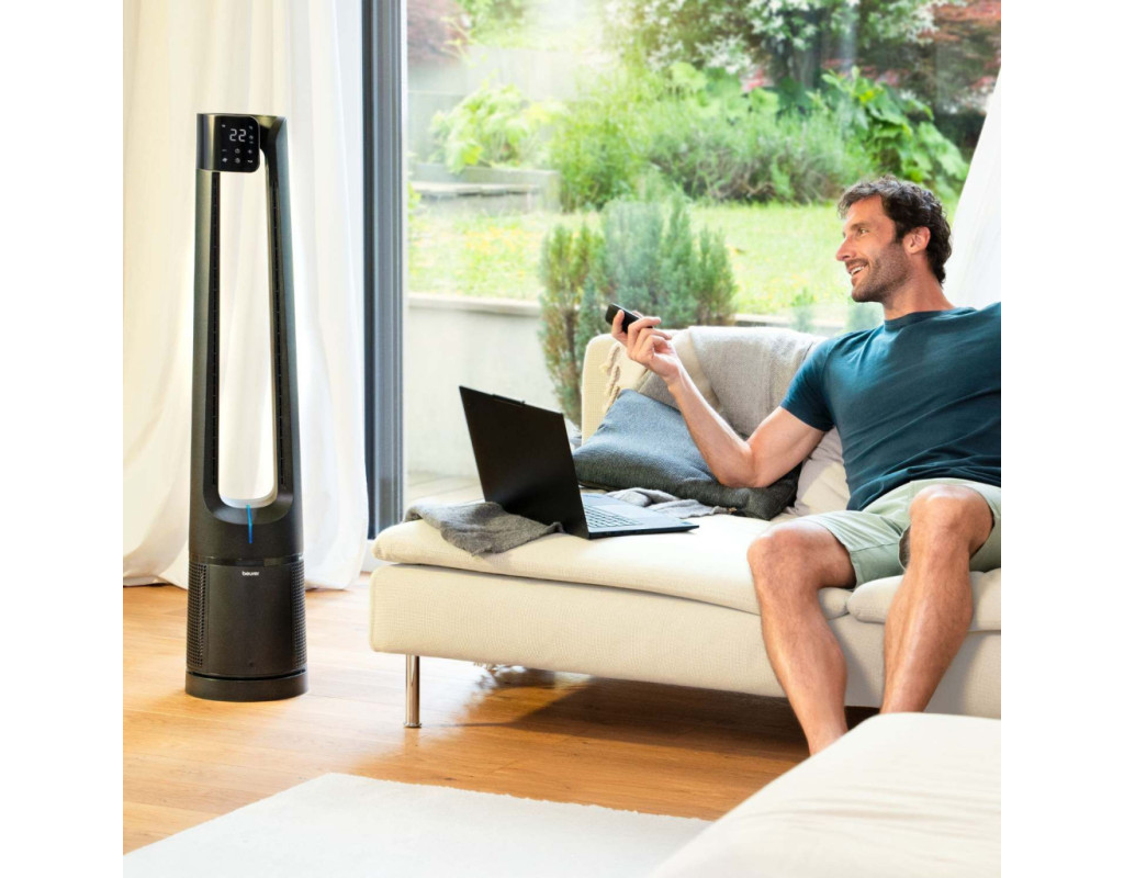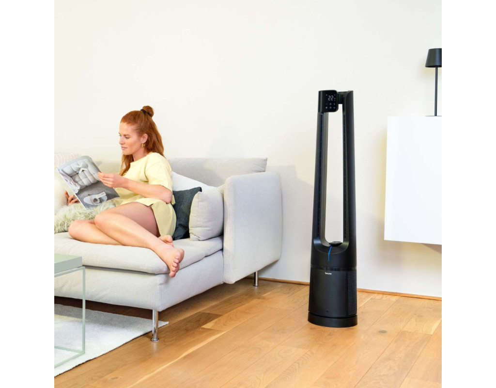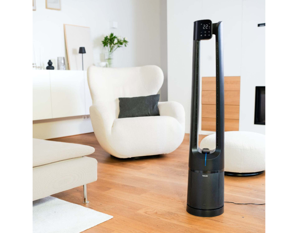 Очищувач повітря та вентилятор 2-в-1 Beurer LV 500 PureFlow Потрібне свіже, чисте та природньо охолоджене повітря в приміщенні? Beurer LV 500 PureFlow поєднує очищення та функцію вентилятора, підтримуючи приємний мікроклімат щодня. Beurer LV 500 PureFlow — універсальний прилад «2 в 1», що поєднує очищення повітря та потужну, але м’яку циркуляцію. Він забезпечує чисте, свіже та комфортно охолоджене повітря в приміщеннях різного типу. Модель оснащена трирівневою фільтрацією (префільтр, HEPA H13, вугільний фільтр), яка затримує пил, алергени, бактерії, віруси й неприємні запахи. Вентилятор працює у 12 рівнях потужності, розподіляючи повітря рівномірно завдяки 130° осциляції — без лопатей і з мінімальним шумом. П’ять програм роботи (Basic, Natural, Sleep, Child, Auto) дозволяють підібрати комфортний режим для різних ситуації: від інтенсивного охолодження до тихої роботи під час сну. Автоматичний режим оцінює якість повітря за датчиком PM2.5 та регулює очищення залежно від рівня забруднення. Поточний стан повітря відображається кольоровим індикатором: зелений — чисте повітря, жовтий — помірне забруднення, червоний — високий рівень забрудненості та потреба в інтенсивному очищенні. Сенсорне керування, наочний LED-дисплей, відображення кімнатної температури та зручний магнітний пульт роблять користування зручним та інтуїтивним. Прилад підходить для спальні, вітальні, дитячої чи офісу, забезпечуючи оптимальний мікроклімат щодня. Основні характеристики: