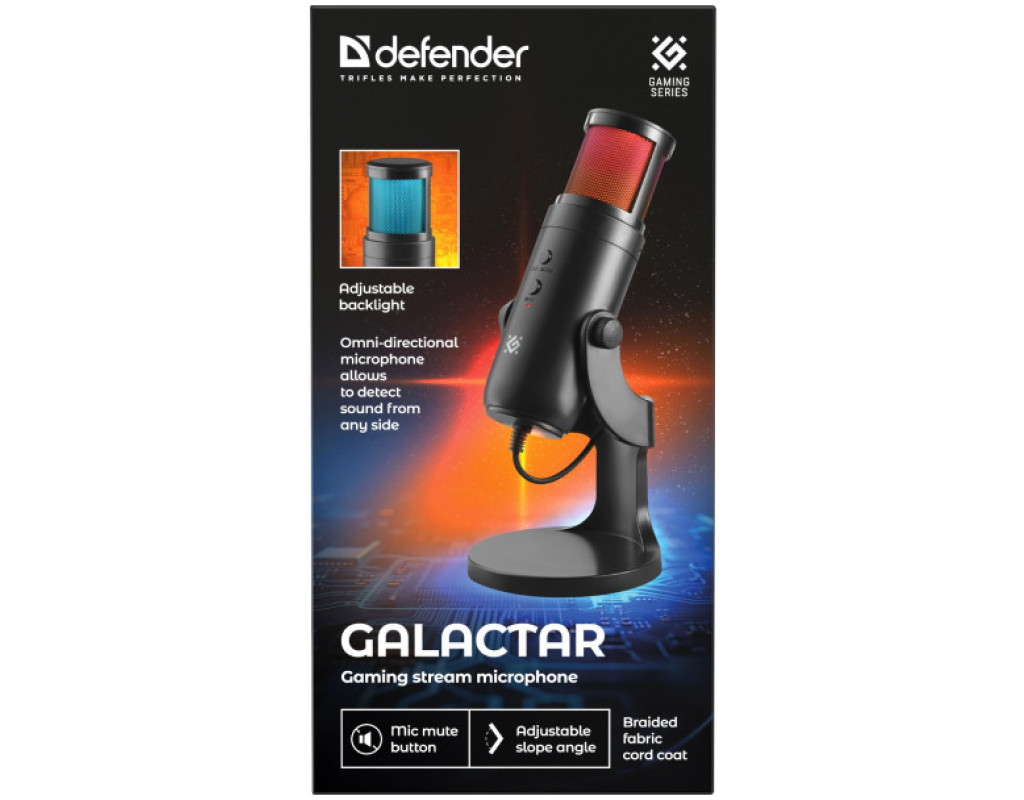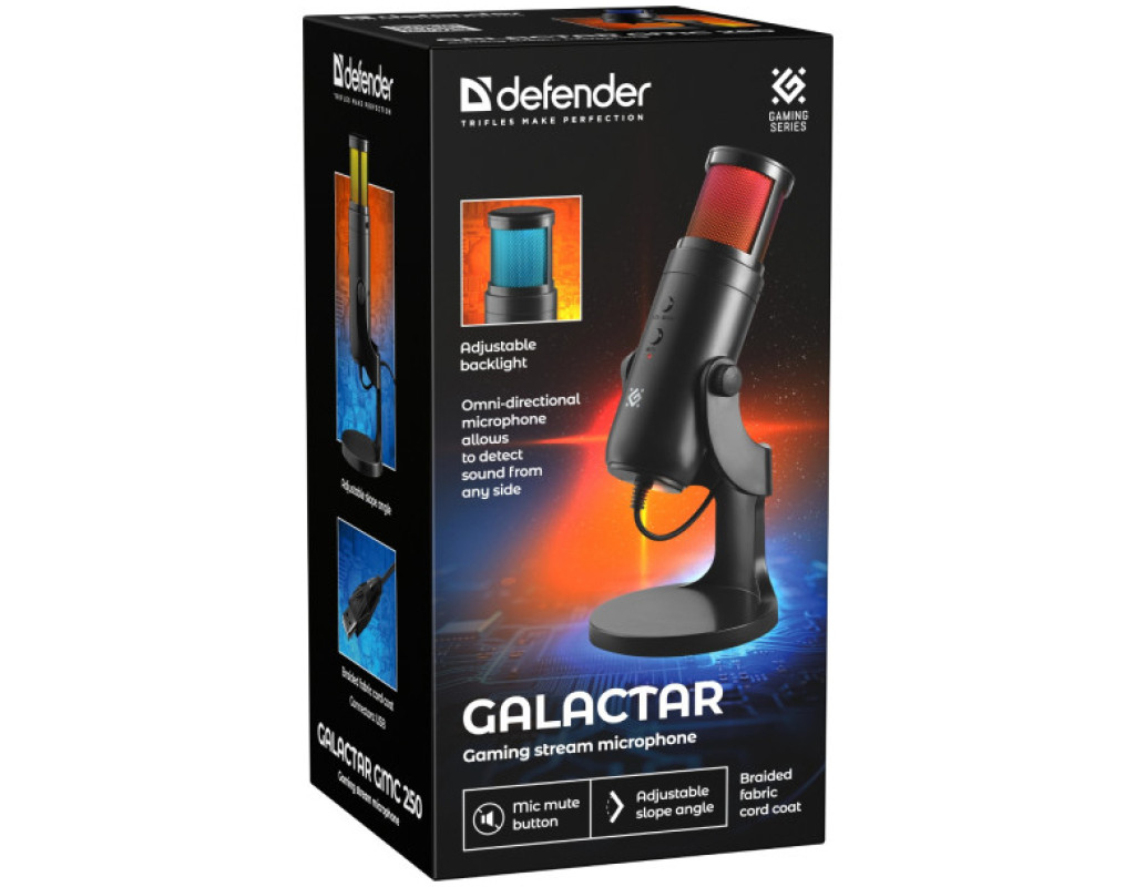 Defender Galactar GMC 250 — це універсальний ігровий та потоковий мікрофон, створений для стримерів, подкастерів і геймерів, яким важлива стабільна якість звучання та стильна подача. Завдяки регульованому RGB-підсвічуванню мікрофон легко вписується в будь-яку геймерську або студійну збірку, додаючи вашому робочому місцю яскравої атмосфери. Пристрій повністю сумісний із будь-яким ПК чи ноутбуком, оснащеним USB-портом, а тому не вимагає складних налаштувань — достатньо просто під’єднати кабель і почати запис. До того ж кабель має тканинне обплетення, яке підвищує його довговічність і захищає від заломів. Мікрофон отримав всеспрямовану характеристику, завдяки якій він однаково добре вловлює звук з будь-якого боку. Це дозволяє вільно розташовувати пристрій на столі, не прив’язуючись до конкретного положення. У комплекті є компактний штатив із регульованим кутом нахилу, що допомагає точно налаштувати положення мікрофона відповідно до вашого стилю роботи чи гри. Для зручності користувача передбачено роз’єм для навушників, що дає змогу контролювати звук у режимі реального часу, а також кнопку вимкнення мікрофона, яка дозволяє швидко відключити запис у потрібний момент. Легкий, компактний і продуманий до дрібниць, Defender Galactar GMC 250 забезпечує чітке звучання, стильний вигляд і інтуїтивне використання — усе, що потрібно для комфортного стримінгу, подкастингу чи онлайн-спілкування. |