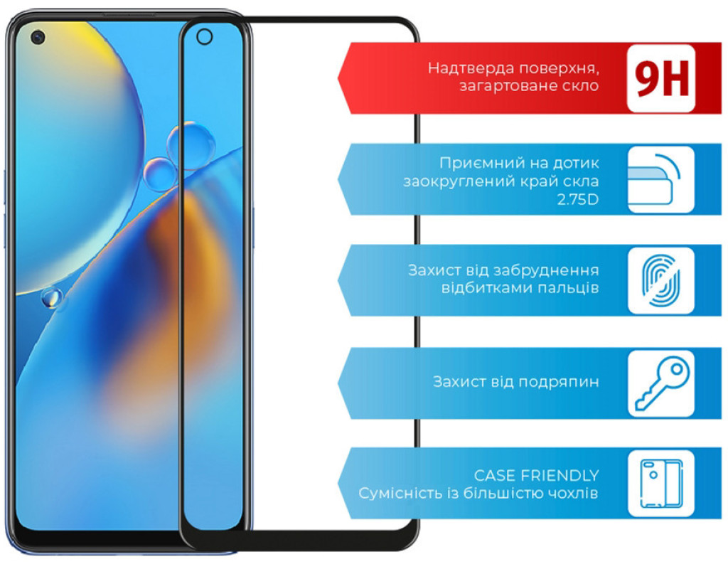 • Рівень міцності: 9H. Мінімізує ризик пошкодження передньої панелі мобільного пристрою під час повсякденного використання.
