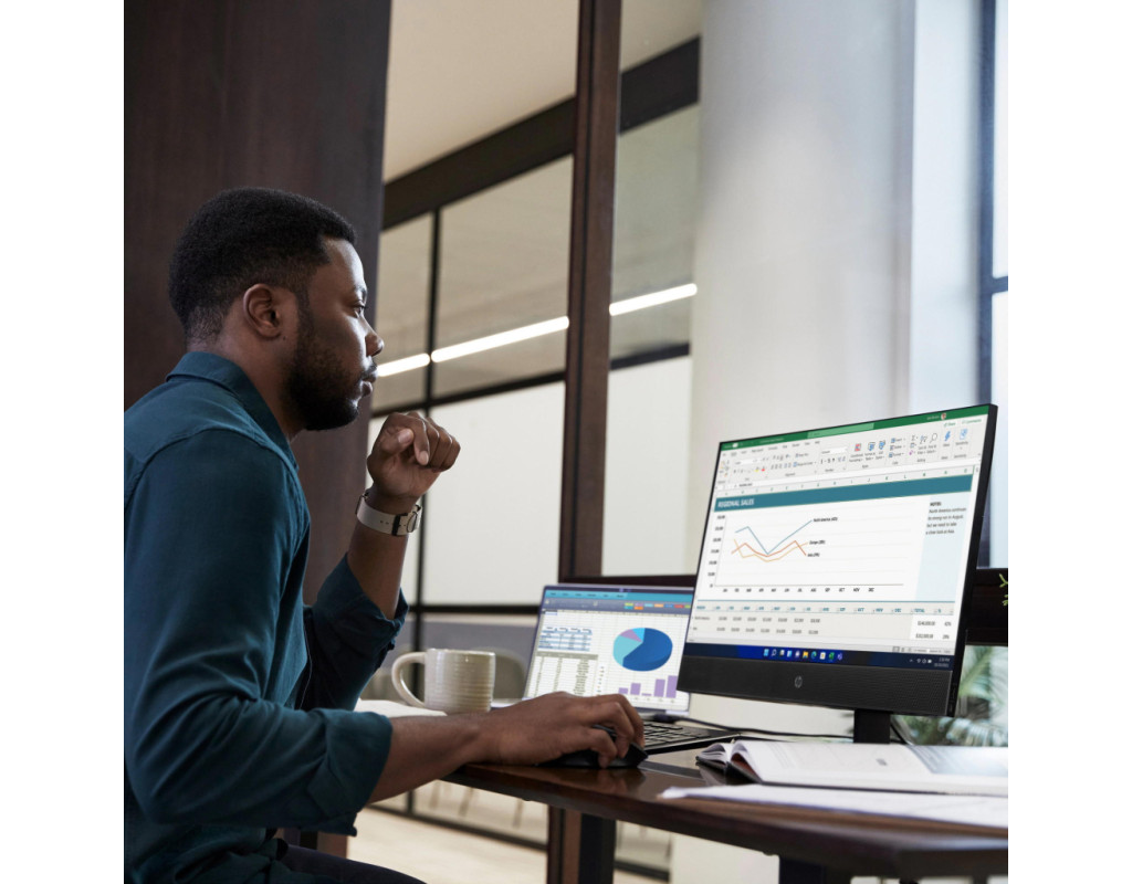 | HP ProOne 440 G9 (A1HP6ES) — моноблок чорного кольору з екраном 23.8" FHD IPS антибліковим покриттям роздільною здатністю 1920×1080. Процесор Intel Core i5-14500 (14 ядер, базова 1.9 ГГц, турбо до 5.0 ГГц) з 16 ГБ DDR5 4800 МГц та SSD 512 ГБ PCIe NVMe забезпечує швидку роботу в офісних задачах. Вбудована графіка Intel UHD 770, веб-камера 5 Мп з мікрофоном, без клавіатури та миші в комплекті. Windows 11 Pro 64-bit встановлено, Wi-Fi 6E та Bluetooth 5.3, вага від 7.77 кг з VESA-кріпленням. Розміри 53.93 × 22.50 × 37.94 см — компактний пристрій для робочого столу. |