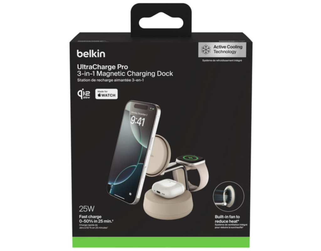 | Заряджайте пристрої максимально швидко та безпечно завдяки інноваційній технології Qi2 25 Вт. Усього за 25 хв iPhone заряджається від 0 до 50 %, а Apple Watch Series 10 – на 80 % за 30 хв. Унікальна система ChillBoost з активним охолодженням підтримує оптимальну температуру пристроїв, роблячи бездротове заряджання так само швидким, як дротове. Завдяки конструкції 3 в 1 док-станція одночасно живить iPhone, Apple Watch та AirPods, зберігаючи простір і порядок без зайвих кабелів. |