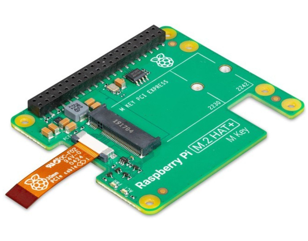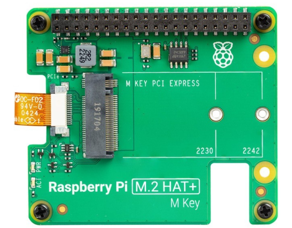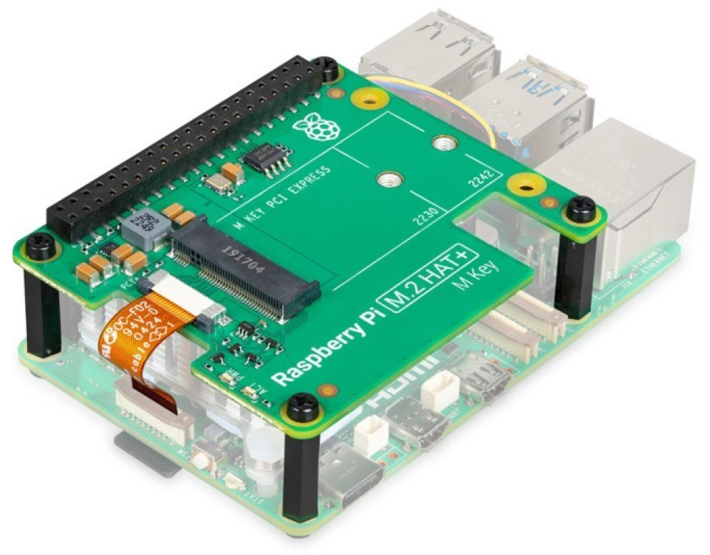 Raspberry Pi M.2 HAT+ дозволяє підключати периферійні пристрої M.2, такі як накопичувачі NVMe і прискорювачі штучного інтелекту, до інтерфейсу PCIe 2.0 Raspberry Pi 5, підтримуючи швидку (до 500 МБ/с) передачу даних на і з накопичувачів NVMe та інших аксесуарів PCIe. Одноканальний інтерфейс PCI Express 2.0 Raspberry Pi 5 виведений на 16-контактний роз'єм FPC з кроком 0,5 мм; M.2 HAT+ M Key — це механічна плата-перехідник, яка забезпечує перехід між цим роз'ємом і підмножиною стандарту M.2. Підтримує пристрої з крайнім роз'ємом M.2 M key у форм-факторах 2230 і 2242. Він здатний подавати до 3 А на підключені пристрої M.2. Raspberry Pi M.2 HAT+ відповідає специфікації Raspberry Pi HAT+ і автоматично визначається найновішим програмним забезпеченням/прошивкою Raspberry Pi. Він постачається з 16-міліметровою стекінговою головкою та різьбовими розпірками, тому його можна встановити на Raspberry Pi 5 з активним кулером Raspberry Pi Active Cooler. |