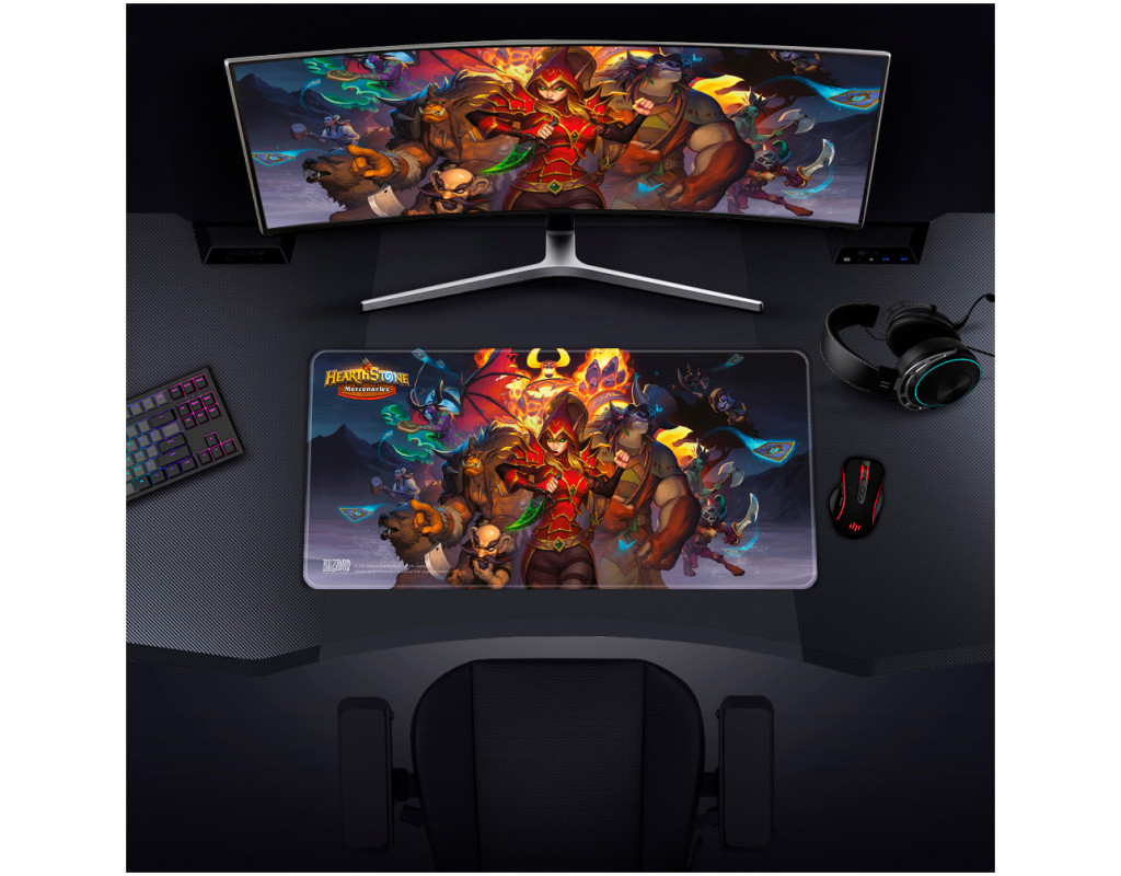 Килимок для ігрової миші має вражаючий дизайн, натхненний найманцями популярної карткової гри Hearthstone. Килимок для миші демонструє ілюстрації кількох найманців із гри, кожен зі своєю унікальною бронею, зброєю та здібностями. Герої зображені в яскравих деталях, зі складним дизайном і сміливими кольорами, що ідеально передають химерний і фантастичний світ Hearthstone. Цей килимок для миші ідеально підходить для шанувальників Hearthstone, які шукають зручну та чутливу поверхню для покращення ігрового досвіду, а також бажають демонструвати свою любов до світу популярної карткової гри. Особливості продукту: