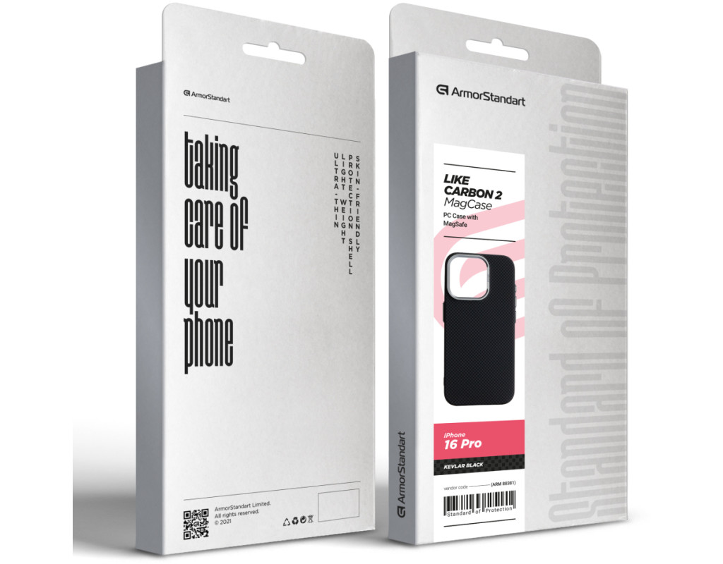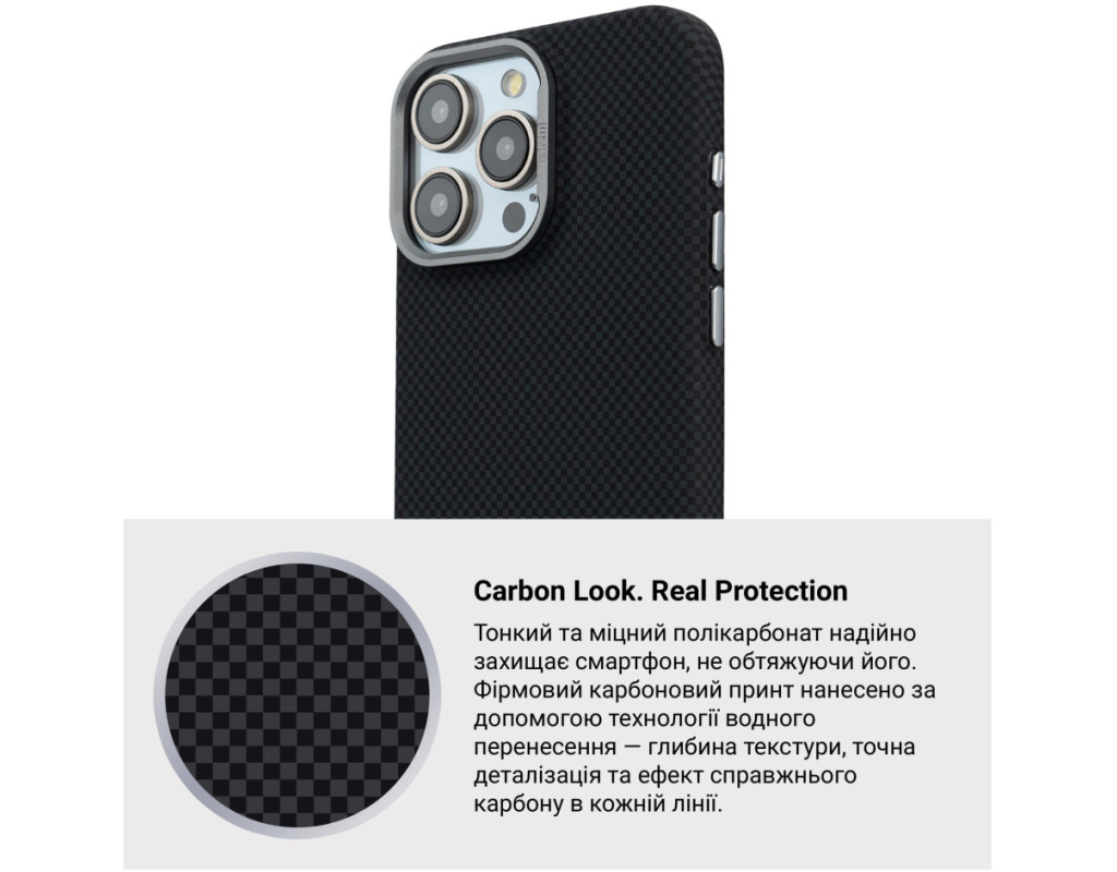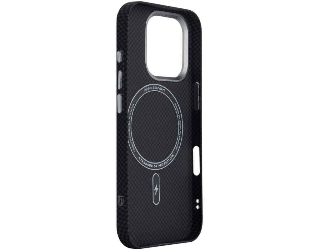 Чохол ArmorStandart LikeCarbon2 MagCase для Apple поєднує у собі міцність, захист і сучасне оформлення. Корпус виготовлений із якісного матового полікарбонату з покриттям, що імітує карбонове волокно. Міцні алюмінієві кнопки та рамка навколо камери підвищують загальну зносостійкість аксесуара. Чохол забезпечує надійний захист смартфона від ударів, падінь, подряпин та інших механічних пошкоджень. Підняті краї навколо блоку камери захищають об’єктиви від контакту з поверхнями, що важливо для збереження якості фото- та відеозйомки. Вбудовані магніти стандарту N52 дозволяють використовувати аксесуар з MagSafe та іншими сумісними пристроями та тримачами. ArmorStandart LikeCarbon2 MagCase — це практичне рішення для повсякденного захисту вашого смартфона. Особливості: