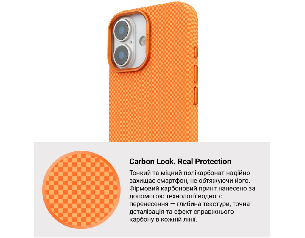 Чохол ArmorStandart LikeCarbon2 MagCase для Apple поєднує у собі міцність, захист і сучасне оформлення. Корпус виготовлений із якісного матового полікарбонату з покриттям, що імітує карбонове волокно. Міцні алюмінієві кнопки та рамка навколо камери підвищують загальну зносостійкість аксесуара. Чохол забезпечує надійний захист смартфона від ударів, падінь, подряпин та інших механічних пошкоджень. Підняті краї навколо блоку камери захищають об’єктиви від контакту з поверхнями, що важливо для збереження якості фото- та відеозйомки. Вбудовані магніти стандарту N52 дозволяють використовувати аксесуар з MagSafe та іншими сумісними пристроями та тримачами. ArmorStandart LikeCarbon2 MagCase — це практичне рішення для повсякденного захисту вашого смартфона. Особливості:
