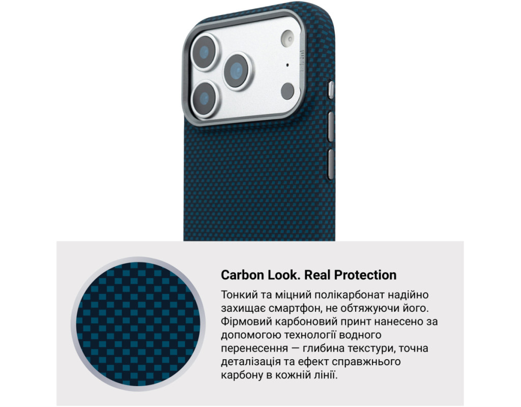 Чохол ArmorStandart LikeCarbon2 MagCase для Apple поєднує у собі міцність, захист і сучасне оформлення. Корпус виготовлений із якісного матового полікарбонату з покриттям, що імітує карбонове волокно. Міцні алюмінієві кнопки та рамка навколо камери підвищують загальну зносостійкість аксесуара. Чохол забезпечує надійний захист смартфона від ударів, падінь, подряпин та інших механічних пошкоджень. Підняті краї навколо блоку камери захищають об’єктиви від контакту з поверхнями, що важливо для збереження якості фото- та відеозйомки. Вбудовані магніти стандарту N52 дозволяють використовувати аксесуар з MagSafe та іншими сумісними пристроями та тримачами. ArmorStandart LikeCarbon2 MagCase — це практичне рішення для повсякденного захисту вашого смартфона. Особливості: