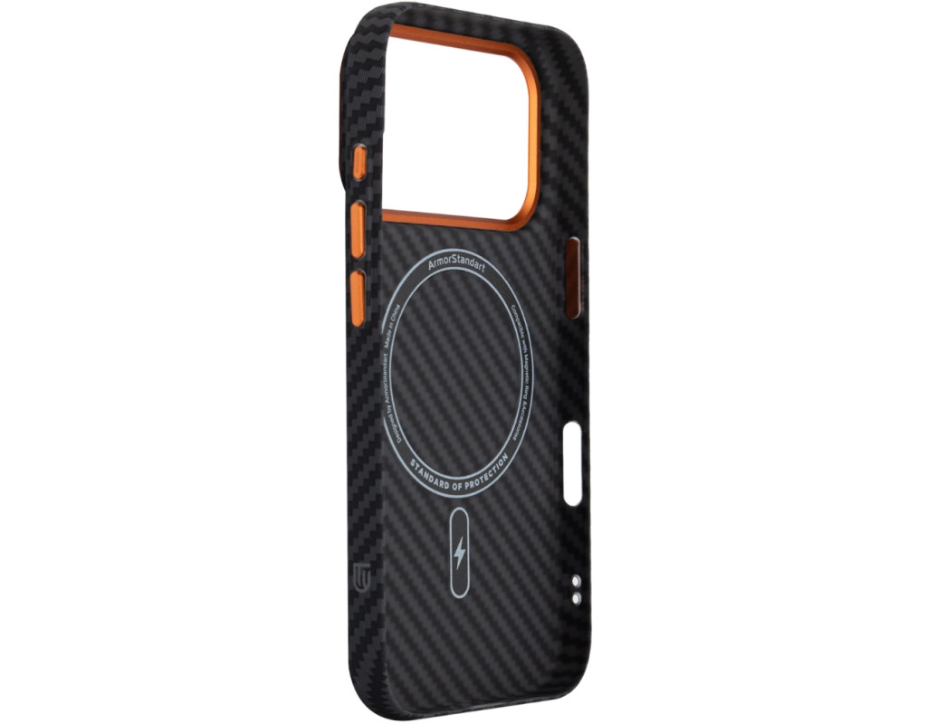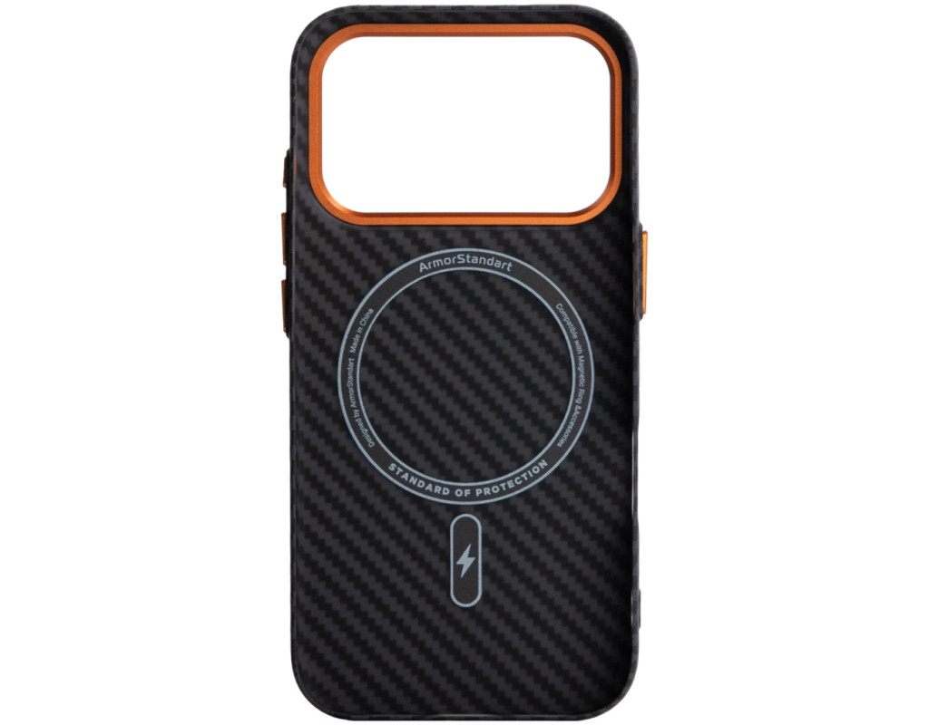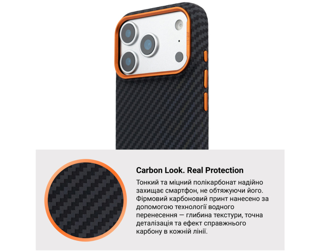Чохол ArmorStandart LikeCarbon2 SE MagCase для Apple є продовженням серії LikeCarbon2 з виразним технічним акцентом. Модель зберігає стриману форму та практичну конструкцію, доповнену контрастними металевими елементами у виконанні SE. Корпус виготовлений із матового полікарбонату з текстурою карбонового волокна. Такий матеріал стійкий до подряпин, не збирає відбитки та зберігає стабільну форму при навантаженнях. Металева рамка навколо камери формує додатковий захисний контур, зменшуючи ризик пошкодження об’єктивів під час контакту з твердими поверхнями. Піднята зона камери обмежує прямий контакт лінз зі столом або іншими площинами. Металеві кнопки мають чіткий і рівномірний хід без люфтів, що забезпечує стабільну та передбачувану роботу під час натискання. Вбудовані магніти стандарту N52 формують точне магнітне кільце, яке надійно утримує смартфон у поєднанні з MagSafe-аксесуарами та сумісними тримачами, запобігаючи зміщенню під час використання. ArmorStandart LikeCarbon2 SE MagCase створений як функціональний захисний аксесуар із фокусом на матеріали, зносостійкість і продумані деталі, де кожен елемент має практичне призначення. Особливості: