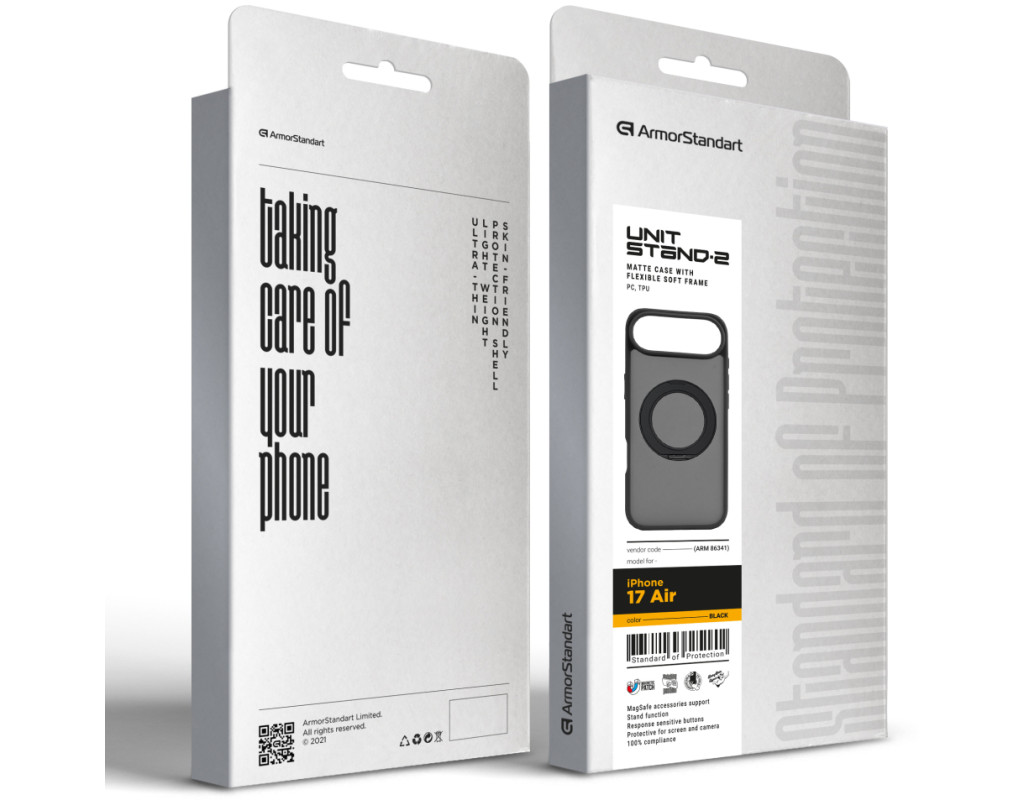 ArmorStandart Unit Stand2 — захисний чохол для Apple iPhone з вбудованою поворотною підставкою та магнітною сумісністю. Модель розрахована на щоденну експлуатацію, де важливі стабільне утримання смартфона, можливість фіксації під кутом і збереження повної функціональності пристрою.