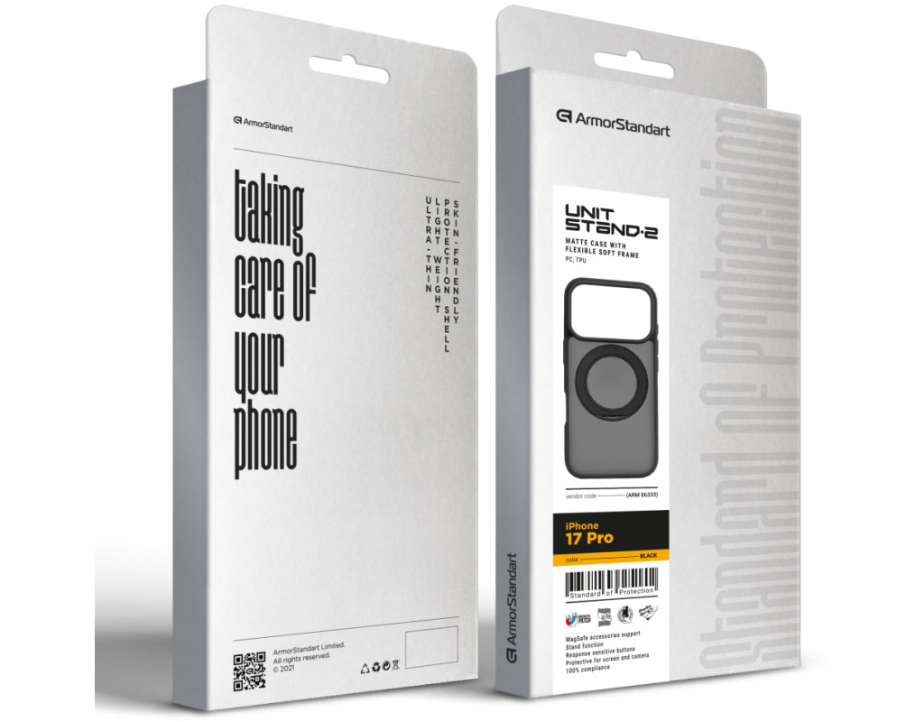 ArmorStandart Unit Stand2 — захисний чохол для Apple iPhone з вбудованою поворотною підставкою та магнітною сумісністю. Модель розрахована на щоденну експлуатацію, де важливі стабільне утримання смартфона, можливість фіксації під кутом і збереження повної функціональності пристрою.