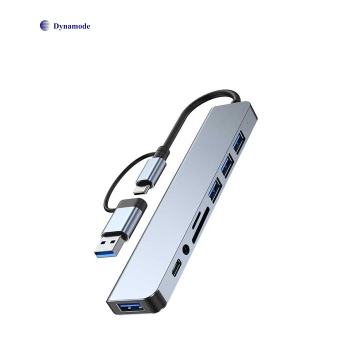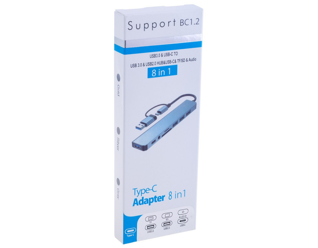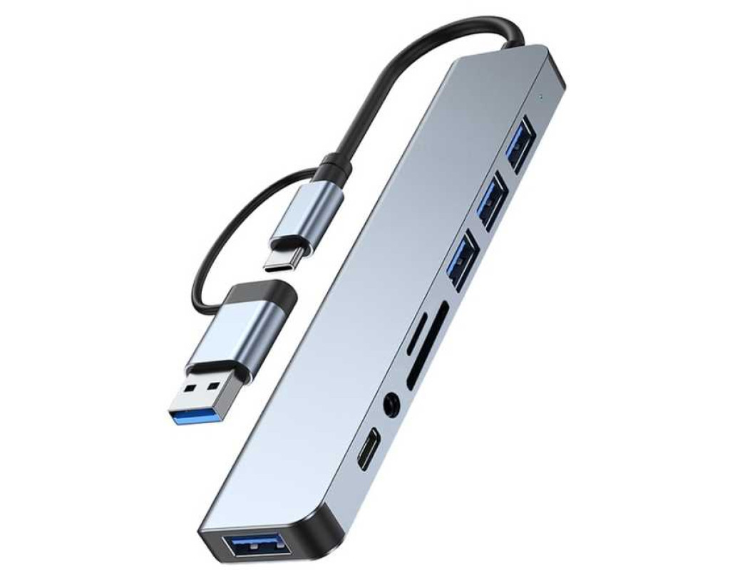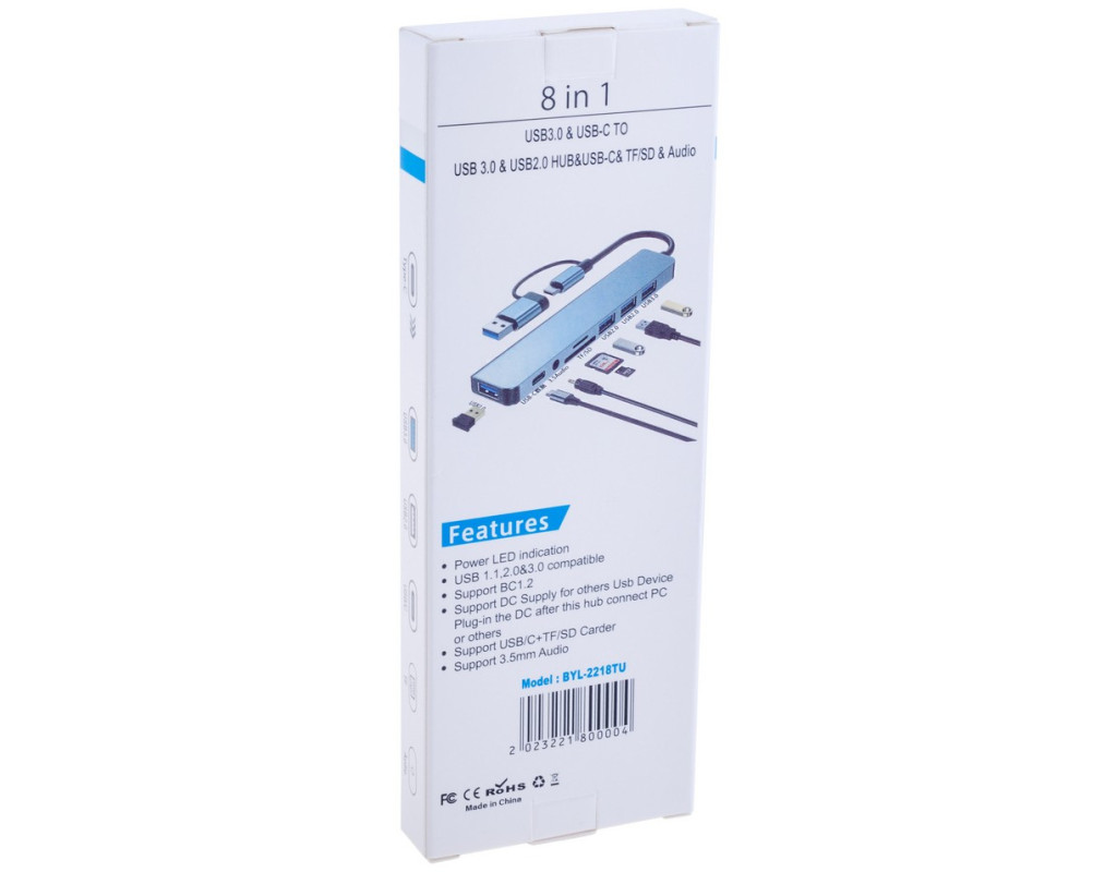 USB-хаб Dynamode BYL-2218TU є мультипортовим адаптером 8-в-1 та має «на борту» порти 1× AUX 3,5 мм, 4× USB Type-A, 1× USB Type-C, а також слоти SD/MicroSD. Він дозволяє розширити інтегровані порти сучасних ультратонких ноутбуків, смартфонів і планшетів. Хаб об’єднує порти USB 3.0, USB 2.0, кардридер для SD і MicroSD/TF-карт, аудіовихід 3,5 мм і порт USB-C, забезпечуючи зручне підключення будь-якої периферії. Таким чином, за допомогою USB-хаба BYL-2218TU ви зможете під'єднати до ноутбука або смартфона з роз’ємом USB Type-A чи Type-C мишу й клавіатуру, портативні жорсткі диски та флешнакопичувачі, аудіоколонки або навушники, мікрофон, а також зчитувати карти пам’яті SD і MicroSD. Зверніть увагу: карти MicroSD і SD не працюють одночасно. USB-хаб має акуратний і стильний дизайн, завдяки чому чудово впишеться в будь-яке робоче місце. Основні характеристики: