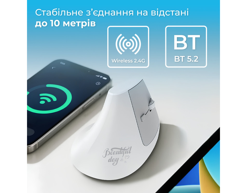 | Мишка Ajazz i300 Wireless/Bluetooth/USB White (i300-W) — це втілення надійного стилю та передових технологій у сфері периферійних пристроїв. Ця миша вражає своєю зручністю і функціональністю, об’єднуючи в собі все необхідне для ефективної роботи та комфорту. Вертикальний дизайн миші Ajazz i300 розроблений спеціально для того, щоб забезпечити природне положення руки, зменшуючи втому і ризик пошкодження зап’ястя. Це ідеальне рішення для тих, хто проводить багато часу за комп'ютером. Завдяки своїй ергономічній формі, вона підходить для тривалого використання без будь-якого дискомфорту. Головна перевага цієї моделі — це універсальність підключення. Вона підтримує дві бездротові технології — Bluetooth і USB-адаптер 2.4 ГГц. Це дає змогу зручно підключатися до кількох пристроїв одночасно та просто перемикатися між ними. Її зручно використовувати з ноутбуками, планшетами чи настільними ПК. Оптичний датчик з максимальною роздільною здатністю 1600 dpi забезпечує точність і плавність руху курсору, а можливість регулювання чутливості дає користувачу повний контроль над його роботою. Шість програмованих кнопок надають можливість налаштування під ваші потреби, що робить Ajazz i300 ідеальною мишкою для виконання різних завдань. Тиха робота кнопок — ще одна перевага, яка дозволяє використовувати мишу без зайвого шуму, що особливо актуально для робочого середовища. Крім того, вбудований акумулятор дозволяє насолоджуватися до 60 годин безперебійної роботи, а заряджання здійснюється через сучасний USB-C інтерфейс. Завдяки своїй компактності і вазі всього 84 г, Ajazz i300 стає чудовим вибором для багатьох ситуацій — від офісу до домашнього використання. Її елегантний білий колір додає стильного акценту будь-якому робочому місцю, підкреслюючи ваш смак і увагу до деталей. Ajazz i300 — це не просто миша, а справжній помічник, який поєднує в собі високу якість, надійність і ергономічний комфорт, забезпечуючи новий рівень роботи з комп’ютером. Комплектація включає USB-A - USB-C кабель і посібник користувача для вашої зручності. |