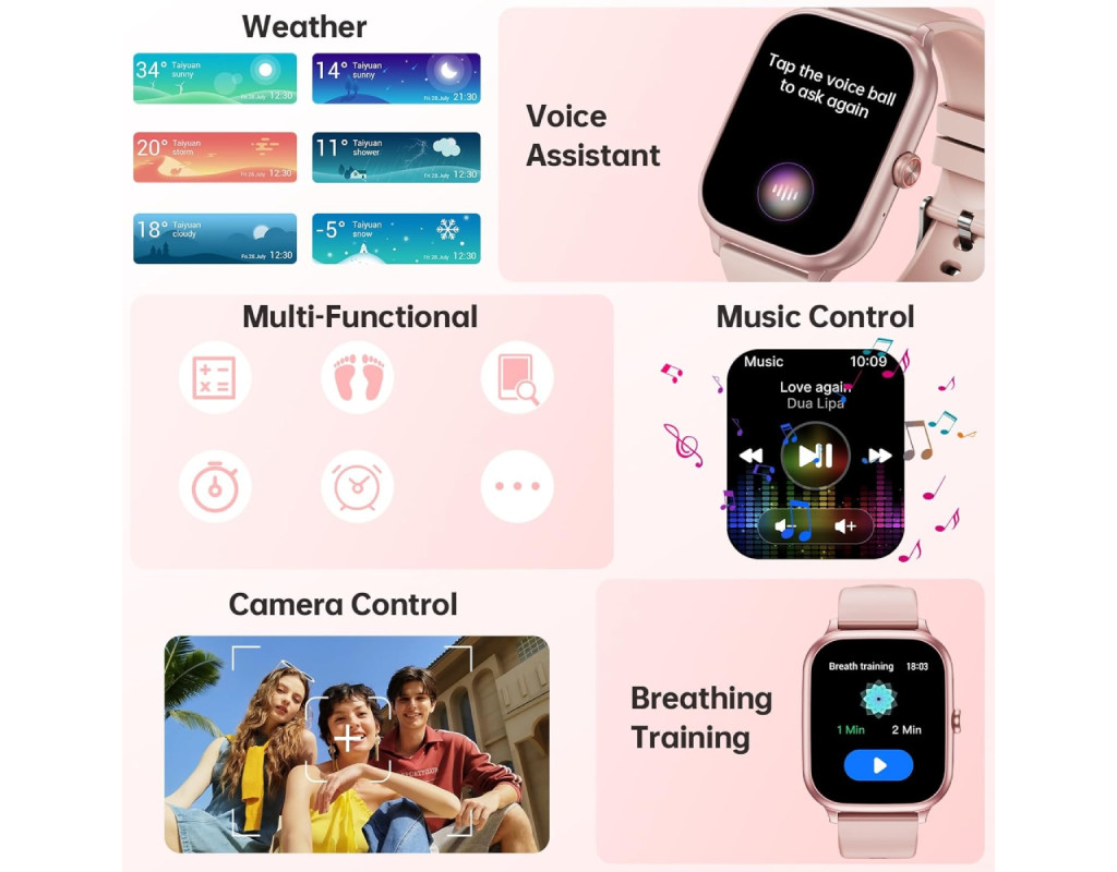 Bluetooth 5.0, Відстеження сну, 100+ спортивних режимів, Акселерометр, Керування музикою, Магнітна зарядка, Пульсометр, Мікрофон, Динамік, Захист за стандартом IP68 |