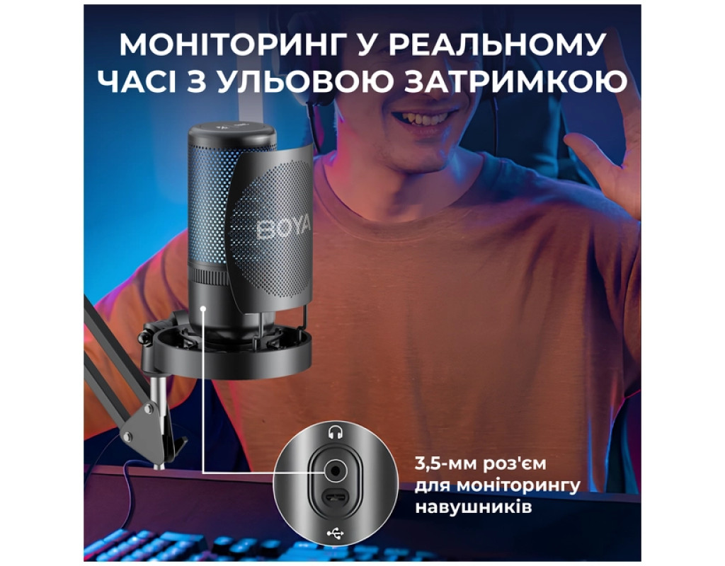 - Моніторинг в реальному часі: Роз'єм 3.5 мм дозволяє підключити навушники і чути свій голос без затримки, контролюючи якість запису.
