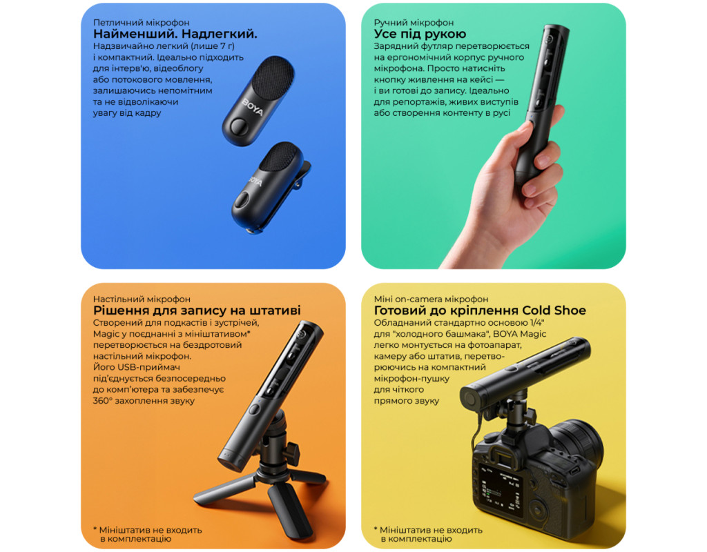 Ласкаво просимо в еру універсального звуку. BOYA Magic — це революційна бездротова мікрофонна система, яка поєднує в собі чотири професійні конфігурації в одному компактному пристрої. Це не просто мікрофон, а ваша портативна звукова студія, створена для сучасного контент-мейкера, блогера, подкастера та професіонала, який цінує якість, гнучкість і простоту. Один мікрофон - чотири варіанти використання.