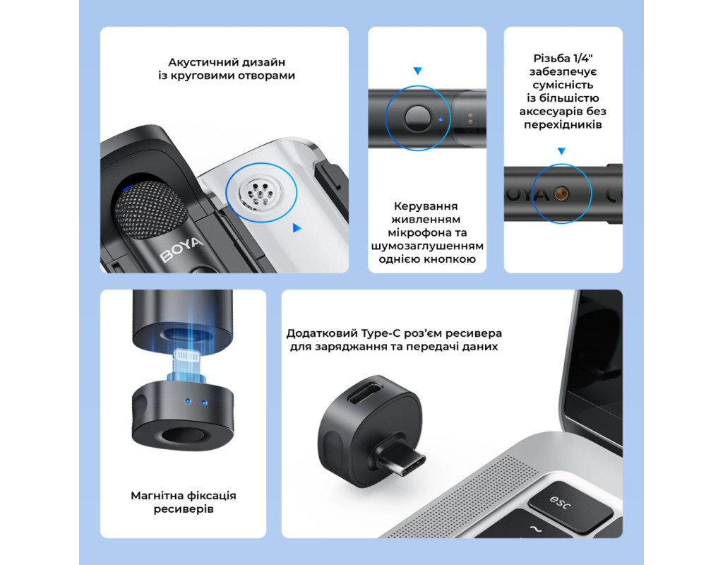 - Настільний мікрофон: Створіть професійну звукову атмосферу для подкастів або відеодзвінків. З'єднайте BOYA Magic з штативом (продається окремо) та під'єднайте USB-приймач безпосередньо до комп'ютера для кругового захоплення звуку.