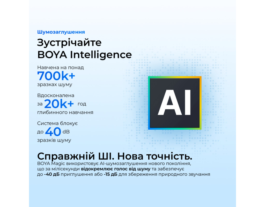 Передові напрацювання в області ШІ для бездоганного звуку. Технологія True AI Noise Cancellation від Boya — це квантовий стрибок у боротьбі з фоновими шумами. Система, натренована на понад 700000 зразків шумів та 20000 годин глибокого навчання, інтелектуально відокремлює ваш голос від навколишнього шуму за мілісекунди. Режим Strong (Потужний): Придушує до -40 дБ небажаних шумів у гучному середовищі (вулиця, кафе, конференції). Режим Light (Легкий): Придушує до -15 дБ, зберігаючи природнє акустичне оточення та зменшуючи білий шум у тихих приміщеннях.