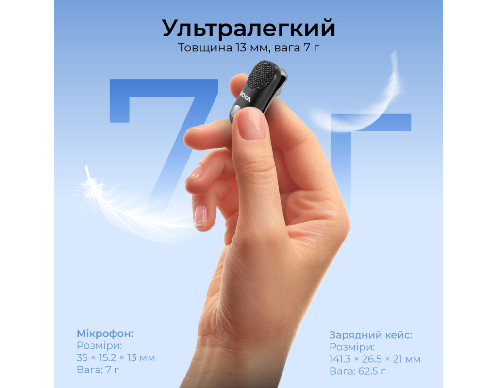 - Петличний мікрофон: Надзвичайно легкий (лише 7 г) і компактний. Ідеально підходить для інтерв'ю, відеоблогу або потокового мовлення, залишаючись непомітним та не відволікаючи увагу від кадру.