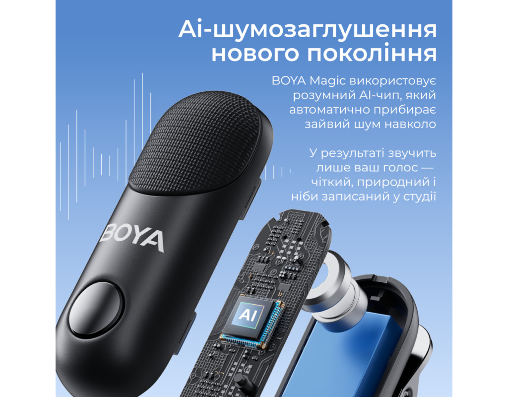 Ласкаво просимо в еру універсального звуку BOYA Magic — це революційна бездротова мікрофонна система, що поєднує чотири професійні конфігурації в одному компактному пристрої. Це не просто мікрофон, а портативна звукова студія для сучасних контент-мейкерів, блогерів, подкастерів і професіоналів, які цінують якість, гнучкість і простоту. Один мікрофон — чотири варіанти використання. Один мікрофон для будь-якого сценарію BOYA Magic легко трансформується під будь-яке завдання без потреби купувати додаткове обладнання. Петличний мікрофон вагою лише 7 г ідеально підходить для інтерв’ю, відеоблогів і стримів, залишаючись майже непомітним у кадрі. Ручний, настільний і камерний формати Зарядний футляр перетворюється на зручний ручний мікрофон — достатньо натиснути кнопку живлення. Для подкастів і відеодзвінків BOYA Magic можна використовувати як настільний мікрофон, підключивши USB-приймач до комп’ютера. А завдяки стандартному кріпленню 1/4" він легко монтується на камеру або штатив, працюючи як компактний мікрофон-пушка. Передові ШІ-технології для чистого звуку Технологія True AI Noise Cancellation, навчена на понад 700 000 зразків шумів і 20 000 годин глибокого навчання, миттєво відокремлює голос від фону. Режим Strong знижує шум до -40 дБ у гучному середовищі, а режим Light — до -15 дБ, зберігаючи природне звучання. Безпека запису та мінімум постобробки Вбудований лімітер запобігає спотворенням від різких гучних звуків. Додаткова резервна доріжка з рівнем -12 дБ записується паралельно з основною, гарантуючи безпечний результат без зайвих правок на монтажі. Тривала автономність і повна сумісність Один мікрофон працює до 6 годин, а зарядний футляр збільшує автономність до 30 годин. Система сумісна зі смартфонами (USB-C / Lightning), комп’ютерами, камерами та іншими пристроями й підтримує одночасну роботу двох передавачів з одним приймачем. Додаток BOYA Central Через безкоштовний додаток ви отримуєте повний контроль: налаштування шумозаглушення, еквалайзер, параметри камери та оновлення прошивки. Наступний крок в аудіотехнологіях BOYA Magic усуває компроміси між якістю, зручністю та вартістю. Це універсальне, інтелектуальне та компактне рішення для будь-якої творчої задачі, де звук має значення. |