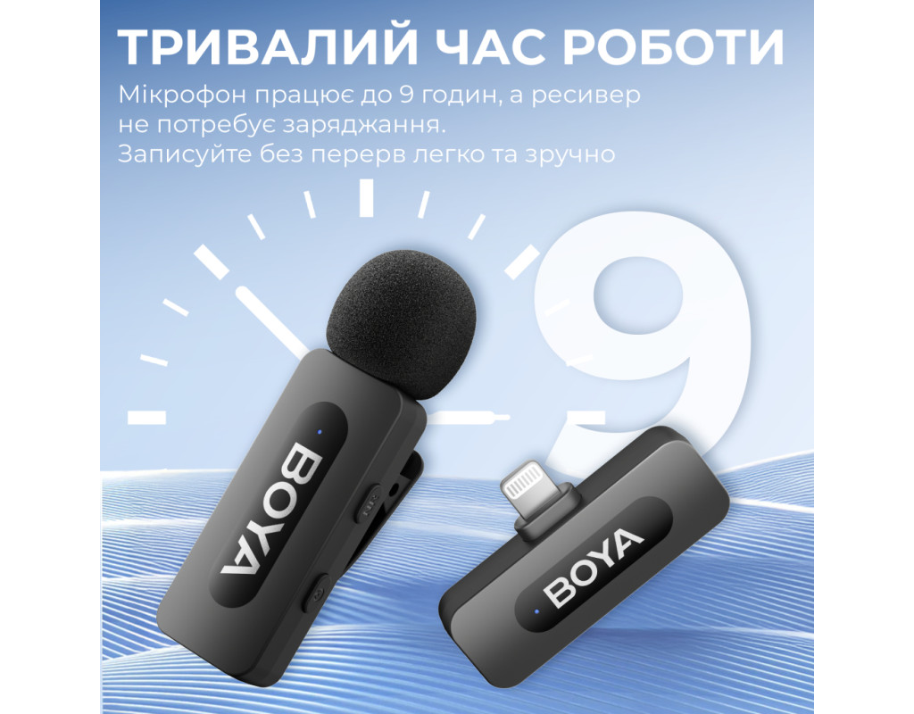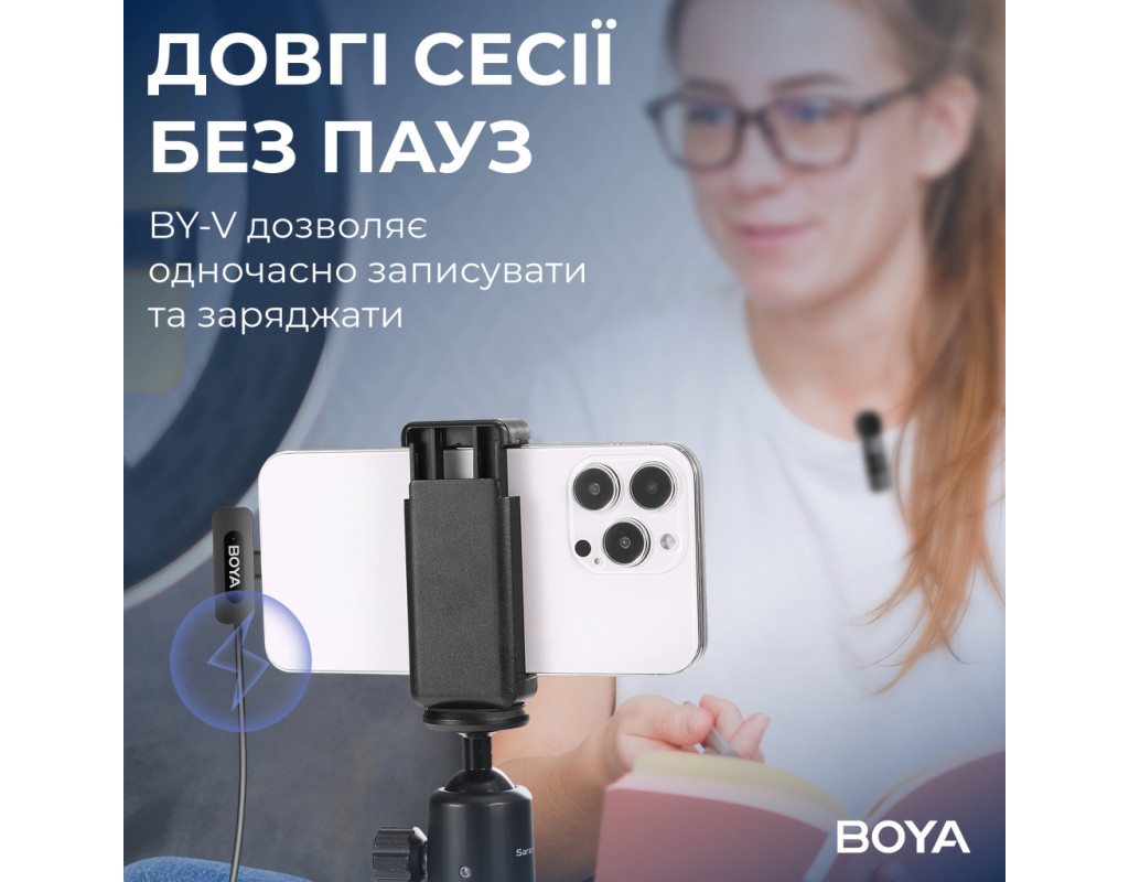 Максимальна простота та зручність. BOYA V працює одразу (Plug-and-Play): Не потрібні додатки, адаптери або складне налаштування Bluetooth. Просто підключіть приймач до роз'єму телефону, закріпіть мікрофон на одязі — і можна починати запис. Миттєве прослуховування запису. Можна швидко прослухати запис через динамік телефону, не відключаючи приймач, що економить час і не порушує робочий процес.
