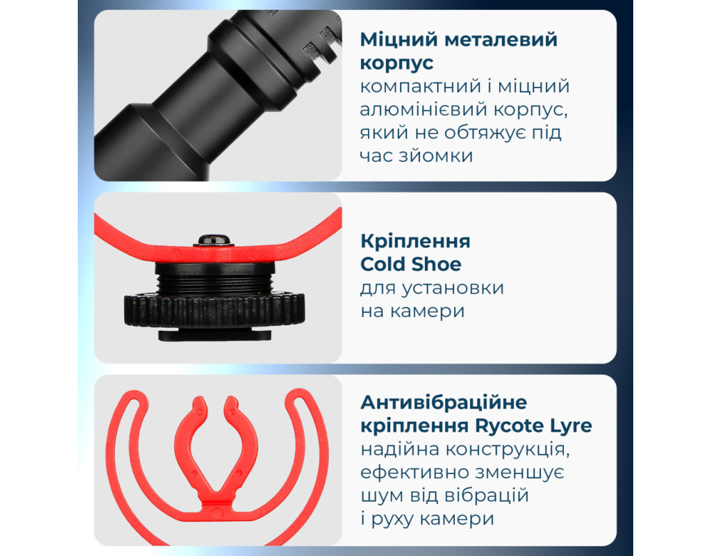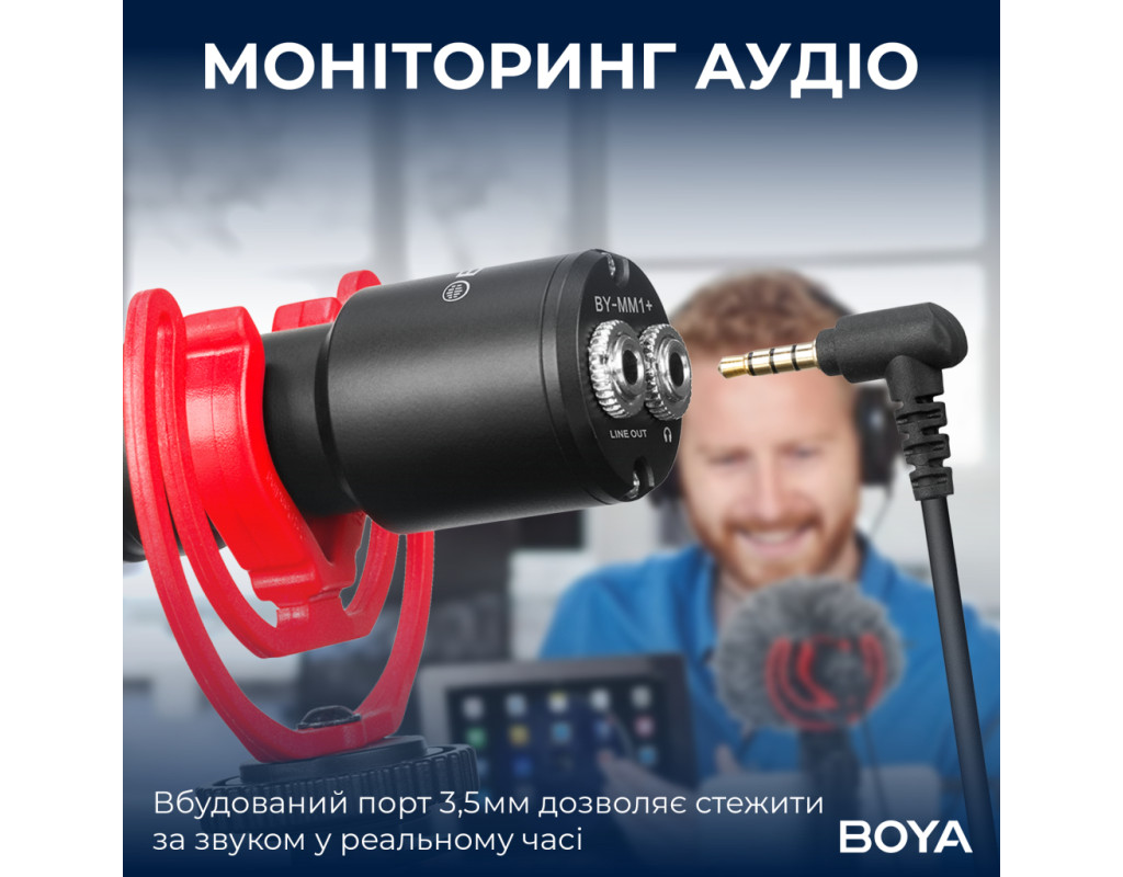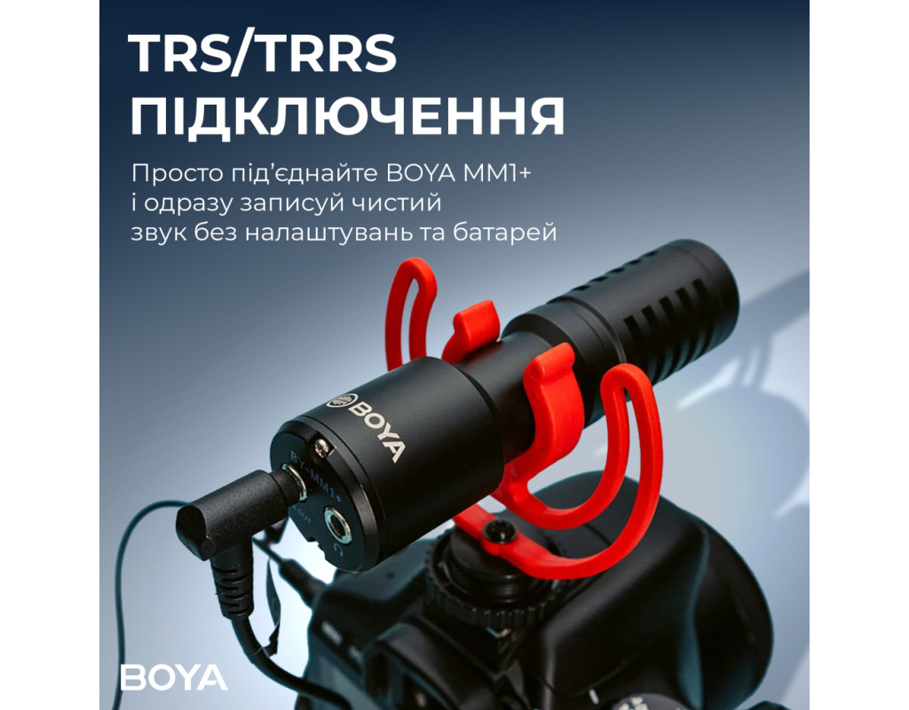 BY-MM1+ — це компактний надкардіоїдний (super-cardioid) накамерний мікрофон-пушка, який кардинально покращує якість звуку під час відеозйомки. Він ідеально підходить для створення контенту, інтерв'ю та влогингу, забезпечуючи професійну чистоту голосу прямо "з коробки".