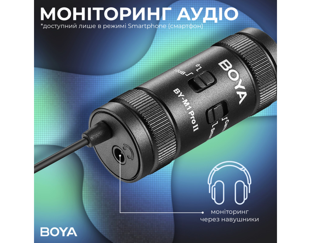 BOYA BY-M1 Pro II має вбудований роз'єм для навушників 3.5 мм, що дозволяє в режимі реального часу моніторити власний голос під час запису (функція доступна при підключенні до смартфона). |